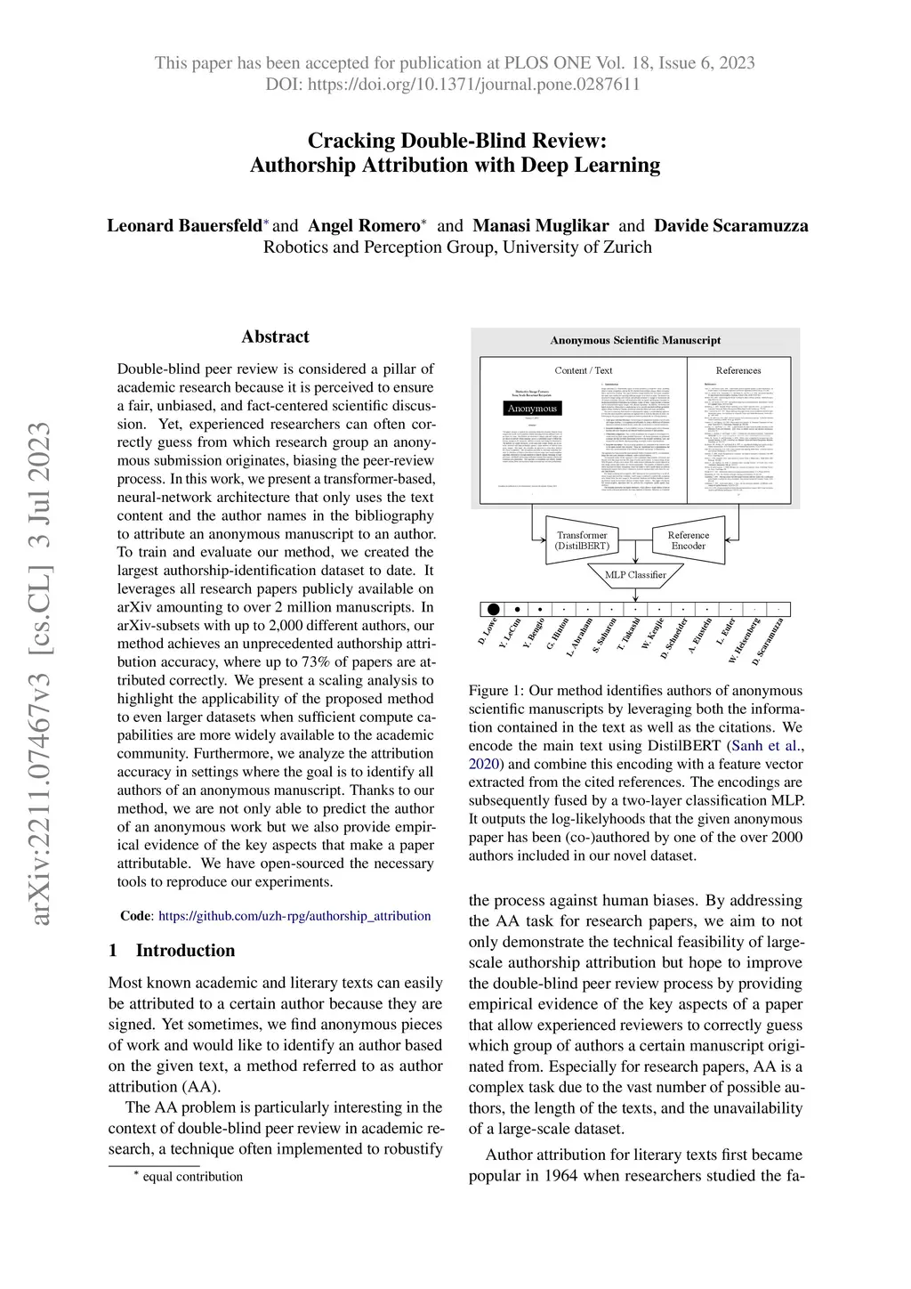 Double-blind peer review is considered a pillar of academic research because it is perceived to ensure a fair, unbiased, and fact-centered scientific discussion. Yet, experienced researchers can often correctly guess from which research group an anonymous submission originates, biasing the peer-review process. In this work, we present a transformer-based, neural-network architecture that only uses the text content and the author names in the bibliography to attribute an anonymous manuscript to an author. To train and evaluate our method, we created the largest authorship identification dataset to date. It leverages all research papers publicly available on arXiv amounting to over 2 million manuscripts. In arXiv-subsets with up to 2,000 different authors, our method achieves an unprecedented authorship attribution accuracy, where up to 73% of papers are attributed correctly. We present a scaling analysis to highlight the applicability of the proposed method to even larger datasets when sufficient compute capabilities are more widely available to the academic community. Furthermore, we analyze the attribution accuracy in settings where the goal is to identify all authors of an anonymous manuscript. Thanks to our method, we are not only able to predict the author of an anonymous work, but we also provide empirical evidence of the key aspects that make a paper attributable. We have open-sourced the necessary tools to reproduce our experiments.