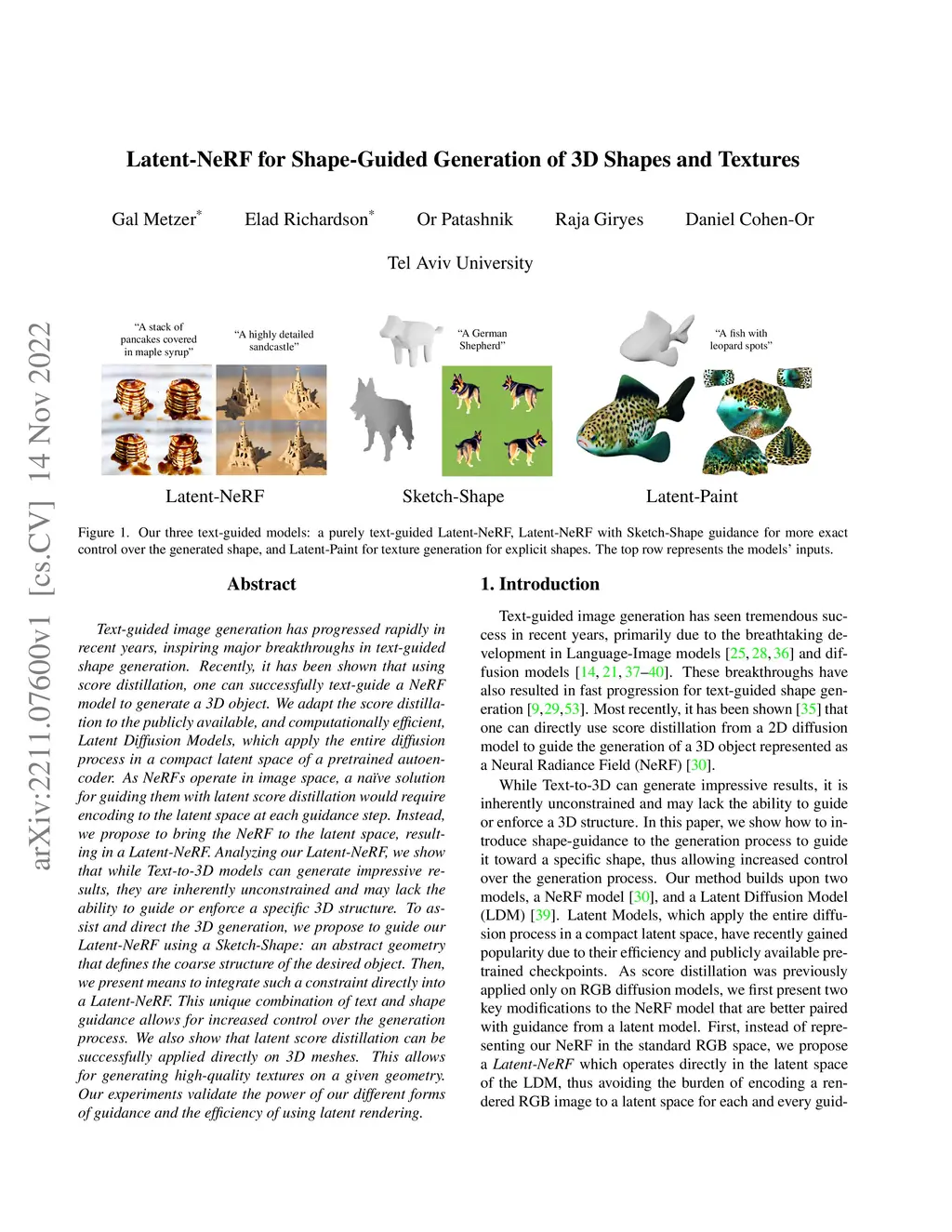 Text-guided image generation has progressed rapidly in recent years, inspiring major breakthroughs in text-guided shape generation. Recently, it has been shown that using score distillation, one can successfully text-guide a NeRF model to generate a 3D object. We adapt the score distillation to the publicly available, and computationally efficient, Latent Diffusion Models, which apply the entire diffusion process in a compact latent space of a pretrained autoencoder. As NeRFs operate in image space, a naive solution for guiding them with latent score distillation would require encoding to the latent space at each guidance step. Instead, we propose to bring the NeRF to the latent space, resulting in a Latent-NeRF. Analyzing our Latent-NeRF, we show that while Text-to-3D models can generate impressive results, they are inherently unconstrained and may lack the ability to guide or enforce a specific 3D structure. To assist and direct the 3D generation, we propose to guide our Latent-NeRF using a Sketch-Shape: an abstract geometry that defines the coarse structure of the desired object. Then, we present means to integrate such a constraint directly into a Latent-NeRF. This unique combination of text and shape guidance allows for increased control over the generation process. We also show that latent score distillation can be successfully applied directly on 3D meshes. This allows for generating high-quality textures on a given geometry. Our experiments validate the power of our different forms of guidance and the efficiency of using latent rendering. Implementation is available at https://github.com/eladrich/latent-nerf