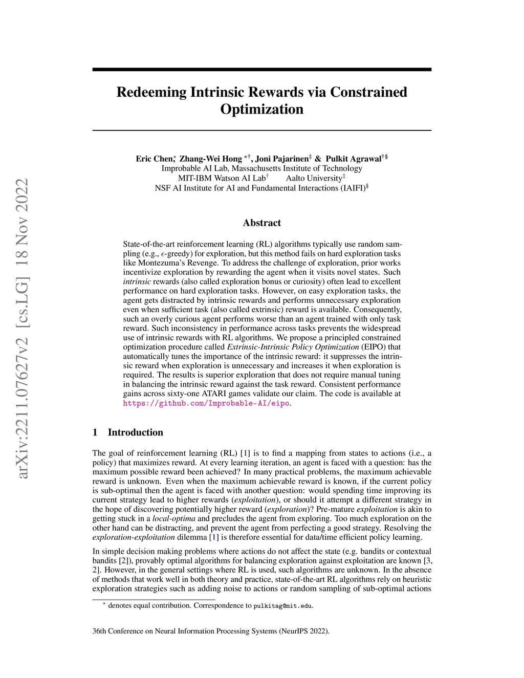 State-of-the-art reinforcement learning (RL) algorithms typically use random sampling (e.g., -greedy) for exploration, but this method fails on hard exploration tasks like Montezuma's Revenge. To address the challenge of exploration, prior works incentivize exploration by rewarding the agent when it visits novel states. Such intrinsic rewards (also called exploration bonus or curiosity) often lead to excellent performance on hard exploration tasks. However, on easy exploration tasks, the agent gets distracted by intrinsic rewards and performs unnecessary exploration even when sufficient task (also called extrinsic) reward is available. Consequently, such an overly curious agent performs worse than an agent trained with only task reward. Such inconsistency in performance across tasks prevents the widespread use of intrinsic rewards with RL algorithms. We propose a principled constrained optimization procedure called Extrinsic-Intrinsic Policy Optimization (EIPO) that automatically tunes the importance of the intrinsic reward: it suppresses the intrinsic reward when exploration is unnecessary and increases it when exploration is required. The results is superior exploration that does not require manual tuning in balancing the intrinsic reward against the task reward. Consistent performance gains across sixty-one ATARI games validate our claim. The code is available at https://github.com/Improbable-AI/eipo.