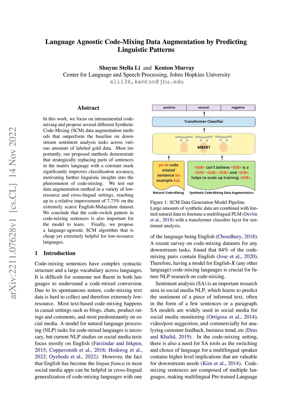 In this work, we focus on intrasentential code-mixing and propose several different Synthetic Code-Mixing (SCM) data augmentation methods that outperform the baseline on downstream sentiment analysis tasks across various amounts of labeled gold data. Most importantly, our proposed methods demonstrate that strategically replacing parts of sentences in the matrix language with a constant mask significantly improves classification accuracy, motivating further linguistic insights into the phenomenon of code-mixing. We test our data augmentation method in a variety of low-resource and cross-lingual settings, reaching up to a relative improvement of 7.73% on the extremely scarce English-Malayalam dataset. We conclude that the code-switch pattern in code-mixing sentences is also important for the model to learn. Finally, we propose a language-agnostic SCM algorithm that is cheap yet extremely helpful for low-resource languages.
