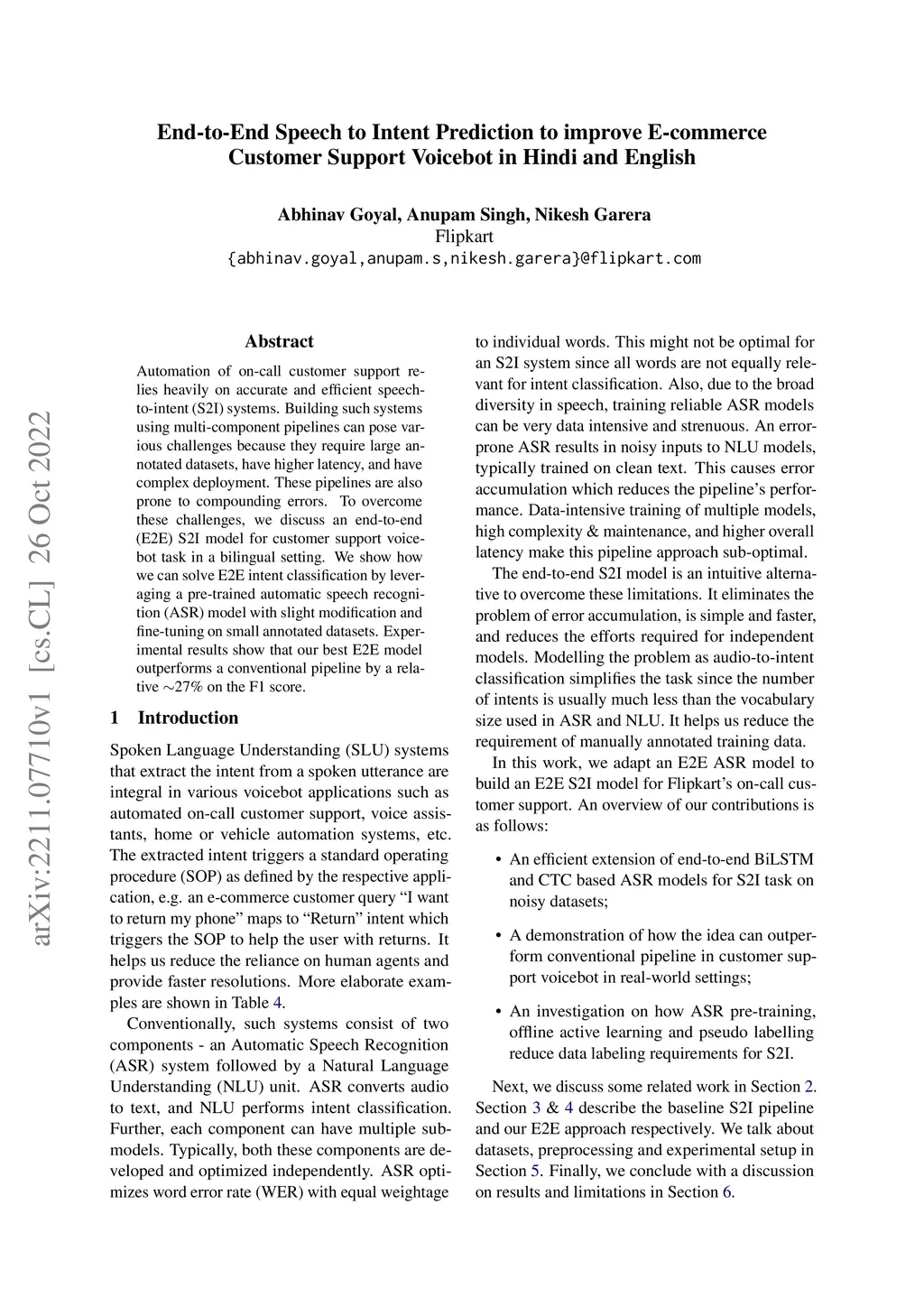Automation of on-call customer support relies heavily on accurate and efficient speech-to-intent (S2I) systems. Building such systems using multi-component pipelines can pose various challenges because they require large annotated datasets, have higher latency, and have complex deployment. These pipelines are also prone to compounding errors. To overcome these challenges, we discuss an end-to-end (E2E) S2I model for customer support voicebot task in a bilingual setting. We show how we can solve E2E intent classification by leveraging a pre-trained automatic speech recognition (ASR) model with slight modification and fine-tuning on small annotated datasets. Experimental results show that our best E2E model outperforms a conventional pipeline by a relative ~27% on the F1 score.