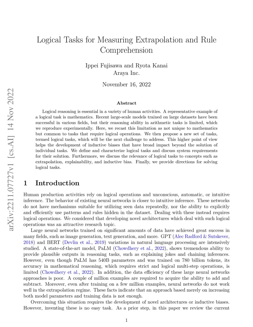 Logical reasoning is essential in a variety of human activities. A representative example of a logical task is mathematics. Recent large-scale models trained on large datasets have been successful in various fields, but their reasoning ability in arithmetic tasks is limited, which we reproduce experimentally. Here, we recast this limitation as not unique to mathematics but common to tasks that require logical operations. We then propose a new set of tasks, termed logical tasks, which will be the next challenge to address. This higher point of view helps the development of inductive biases that have broad impact beyond the solution of individual tasks. We define and characterize logical tasks and discuss system requirements for their solution. Furthermore, we discuss the relevance of logical tasks to concepts such as extrapolation, explainability, and inductive bias. Finally, we provide directions for solving logical tasks.