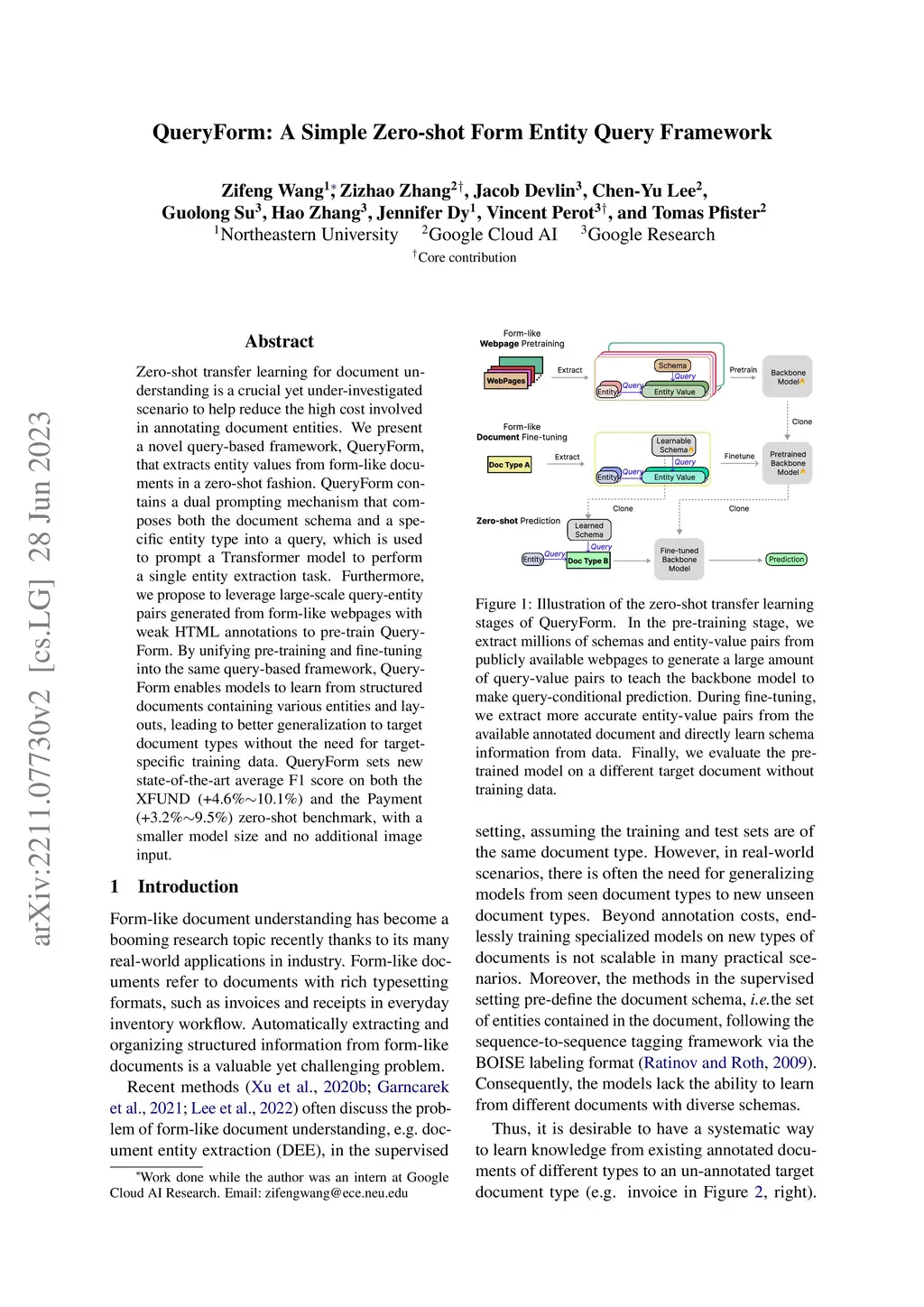 Zero-shot transfer learning for document understanding is a crucial yet under-investigated scenario to help reduce the high cost involved in annotating document entities. We present a novel query-based framework, QueryForm, that extracts entity values from form-like documents in a zero-shot fashion. QueryForm contains a dual prompting mechanism that composes both the document schema and a specific entity type into a query, which is used to prompt a Transformer model to perform a single entity extraction task. Furthermore, we propose to leverage large-scale query-entity pairs generated from form-like webpages with weak HTML annotations to pre-train QueryForm. By unifying pre-training and fine-tuning into the same query-based framework, QueryForm enables models to learn from structured documents containing various entities and layouts, leading to better generalization to target document types without the need for target-specific training data. QueryForm sets new state-of-the-art average F1 score on both the XFUND (+4.6%~10.1%) and the Payment (+3.2%~9.5%) zero-shot benchmark, with a smaller model size and no additional image input.
