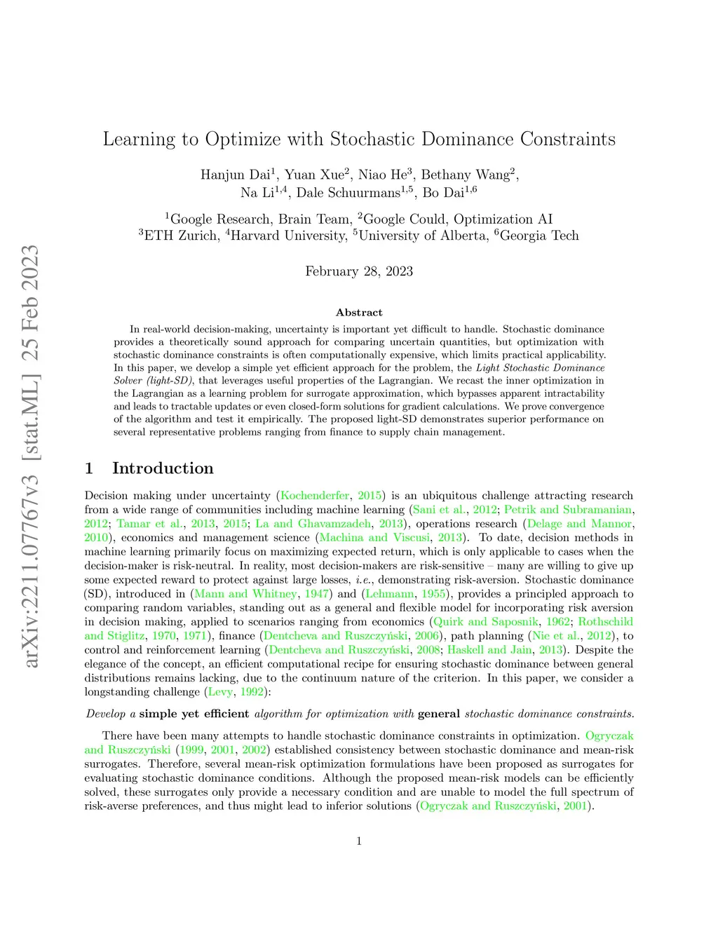In real-world decision-making, uncertainty is important yet difficult to handle. Stochastic dominance provides a theoretically sound approach for comparing uncertain quantities, but optimization with stochastic dominance constraints is often computationally expensive, which limits practical applicability. In this paper, we develop a simple yet efficient approach for the problem, the Light Stochastic Dominance Solver (light-SD), that leverages useful properties of the Lagrangian. We recast the inner optimization in the Lagrangian as a learning problem for surrogate approximation, which bypasses apparent intractability and leads to tractable updates or even closed-form solutions for gradient calculations. We prove convergence of the algorithm and test it empirically. The proposed light-SD demonstrates superior performance on several representative problems ranging from finance to supply chain management.
