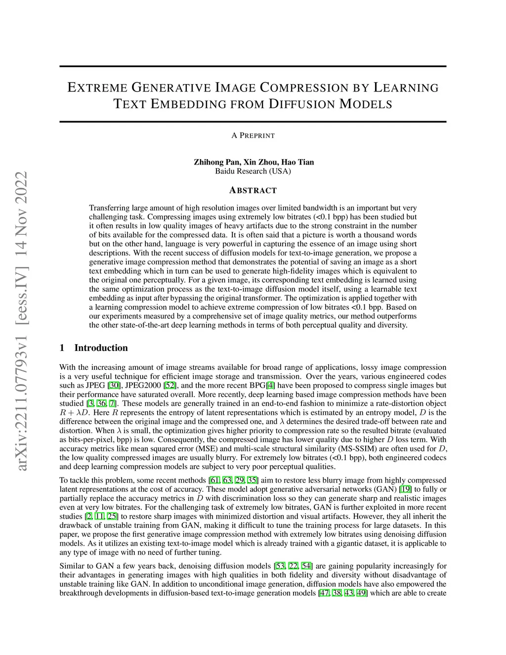 Transferring large amount of high resolution images over limited bandwidth is an important but very challenging task. Compressing images using extremely low bitrates (<0.1 bpp) has been studied but it often results in low quality images of heavy artifacts due to the strong constraint in the number of bits available for the compressed data. It is often said that a picture is worth a thousand words but on the other hand, language is very powerful in capturing the essence of an image using short descriptions. With the recent success of diffusion models for text-to-image generation, we propose a generative image compression method that demonstrates the potential of saving an image as a short text embedding which in turn can be used to generate high-fidelity images which is equivalent to the original one perceptually. For a given image, its corresponding text embedding is learned using the same optimization process as the text-to-image diffusion model itself, using a learnable text embedding as input after bypassing the original transformer. The optimization is applied together with a learning compression model to achieve extreme compression of low bitrates <0.1 bpp. Based on our experiments measured by a comprehensive set of image quality metrics, our method outperforms the other state-of-the-art deep learning methods in terms of both perceptual quality and diversity.