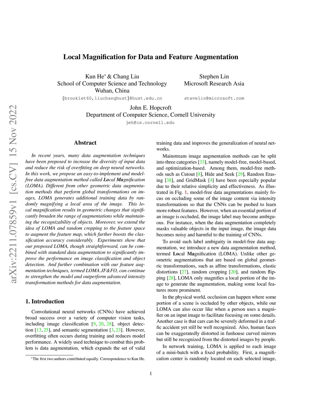 In recent years, many data augmentation techniques have been proposed to increase the diversity of input data and reduce the risk of overfitting on deep neural networks. In this work, we propose an easy-to-implement and model-free data augmentation method called Local Magnification (LOMA). Different from other geometric data augmentation methods that perform global transformations on images, LOMA generates additional training data by randomly magnifying a local area of the image. This local magnification results in geometric changes that significantly broaden the range of augmentations while maintaining the recognizability of objects. Moreover, we extend the idea of LOMA and random cropping to the feature space to augment the feature map, which further boosts the classification accuracy considerably. Experiments show that our proposed LOMA, though straightforward, can be combined with standard data augmentation to significantly improve the performance on image classification and object detection. And further combination with our feature augmentation techniques, termed LOMA_IF&FO, can continue to strengthen the model and outperform advanced intensity transformation methods for data augmentation.