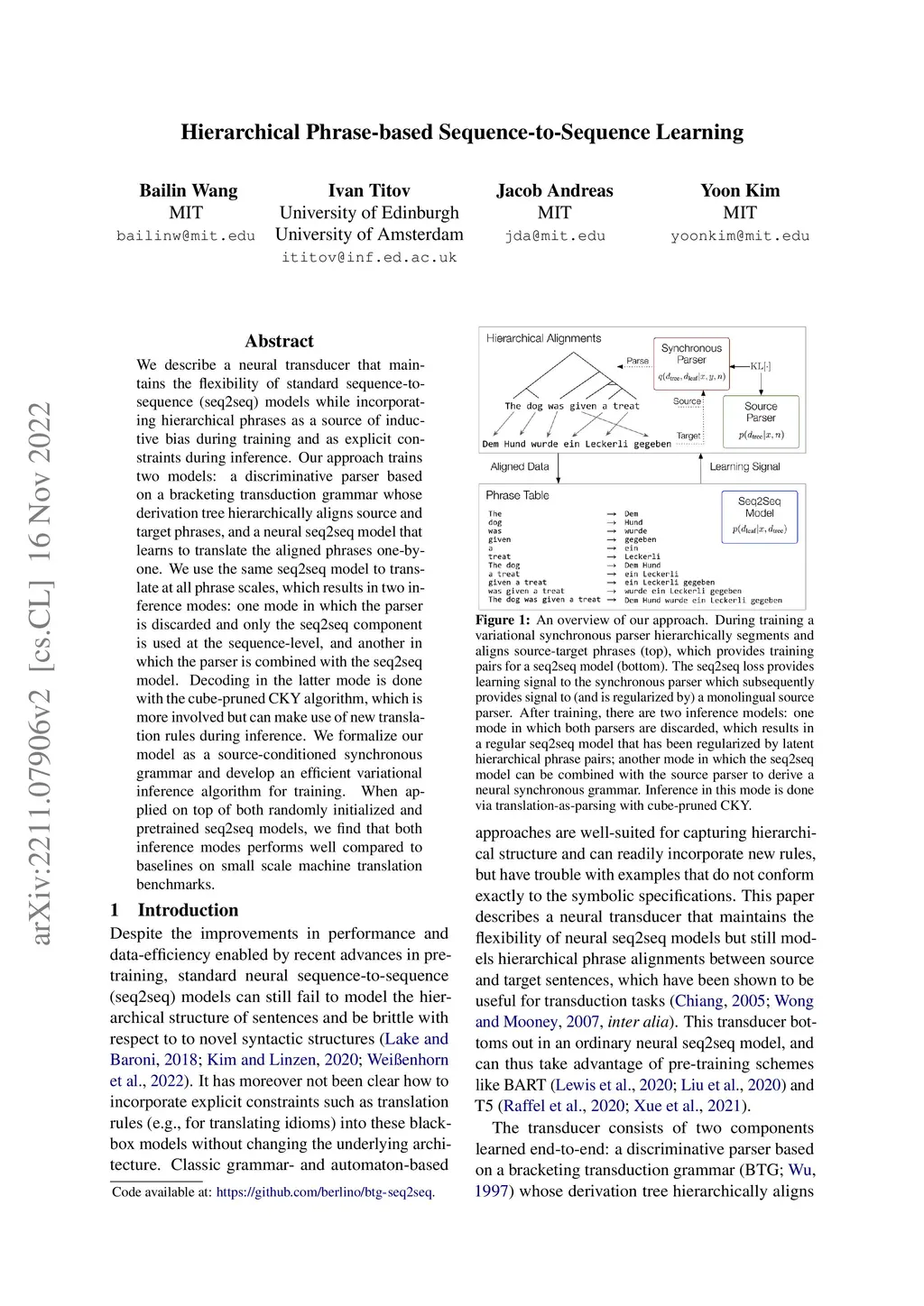 We describe a neural transducer that maintains the flexibility of standard sequence-to-sequence (seq2seq) models while incorporating hierarchical phrases as a source of inductive bias during training and as explicit constraints during inference. Our approach trains two models: a discriminative parser based on a bracketing transduction grammar whose derivation tree hierarchically aligns source and target phrases, and a neural seq2seq model that learns to translate the aligned phrases one-by-one. We use the same seq2seq model to translate at all phrase scales, which results in two inference modes: one mode in which the parser is discarded and only the seq2seq component is used at the sequence-level, and another in which the parser is combined with the seq2seq model. Decoding in the latter mode is done with the cube-pruned CKY algorithm, which is more involved but can make use of new translation rules during inference. We formalize our model as a source-conditioned synchronous grammar and develop an efficient variational inference algorithm for training. When applied on top of both randomly initialized and pretrained seq2seq models, we find that both inference modes performs well compared to baselines on small scale machine translation benchmarks.