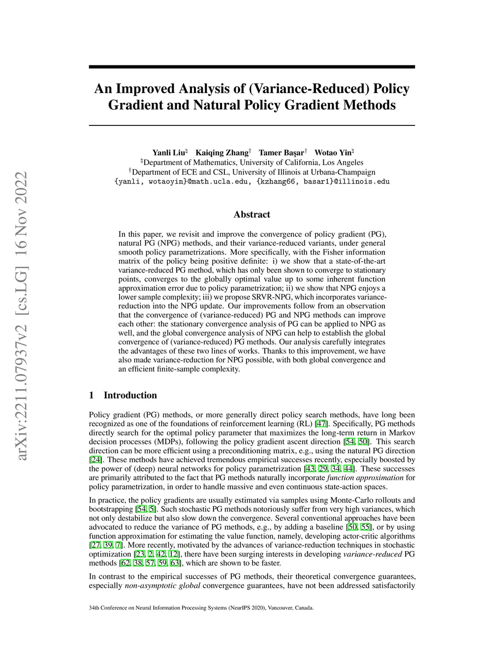 In this paper, we revisit and improve the convergence of policy gradient (PG), natural PG (NPG) methods, and their variance-reduced variants, under general smooth policy parametrizations. More specifically, with the Fisher information matrix of the policy being positive definite: i) we show that a state-of-the-art variance-reduced PG method, which has only been shown to converge to stationary points, converges to the globally optimal value up to some inherent function approximation error due to policy parametrization; ii) we show that NPG enjoys a lower sample complexity; iii) we propose SRVR-NPG, which incorporates variance-reduction into the NPG update. Our improvements follow from an observation that the convergence of (variance-reduced) PG and NPG methods can improve each other: the stationary convergence analysis of PG can be applied to NPG as well, and the global convergence analysis of NPG can help to establish the global convergence of (variance-reduced) PG methods. Our analysis carefully integrates the advantages of these two lines of works. Thanks to this improvement, we have also made variance-reduction for NPG possible, with both global convergence and an efficient finite-sample complexity.