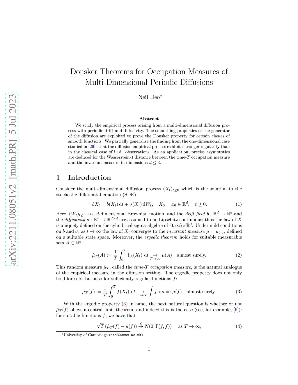 We study the empirical process arising from a multi-dimensional diffusion process with periodic drift and diffusivity. The smoothing properties of the generator of the diffusion are exploited to prove the Donsker property for certain classes of smooth functions. We partially generalise the finding from the one-dimensional case studied in [van der Vaart & van Zanten, 2005]: that the diffusion empirical process exhibits stronger regularity than in the classical case of i.i.d. observations. As an application, precise asymptotics are deduced for the Wasserstein-1 distance between the time- occupation measure and the invariant measure in dimensions .