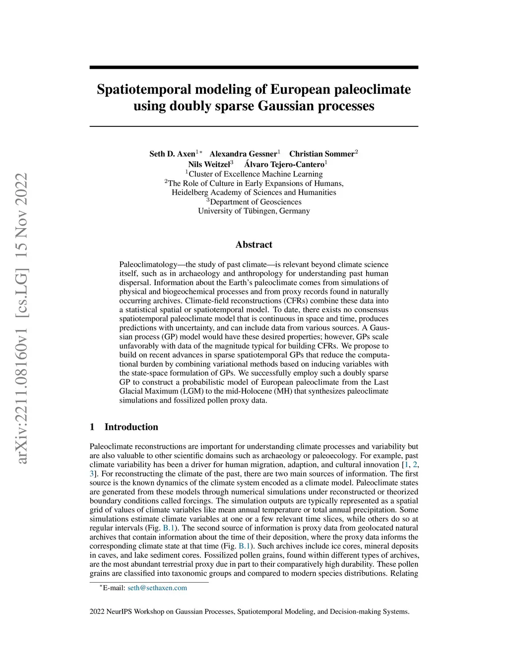 Paleoclimatology -- the study of past climate -- is relevant beyond climate science itself, such as in archaeology and anthropology for understanding past human dispersal. Information about the Earth's paleoclimate comes from simulations of physical and biogeochemical processes and from proxy records found in naturally occurring archives. Climate-field reconstructions (CFRs) combine these data into a statistical spatial or spatiotemporal model. To date, there exists no consensus spatiotemporal paleoclimate model that is continuous in space and time, produces predictions with uncertainty, and can include data from various sources. A Gaussian process (GP) model would have these desired properties; however, GPs scale unfavorably with data of the magnitude typical for building CFRs. We propose to build on recent advances in sparse spatiotemporal GPs that reduce the computational burden by combining variational methods based on inducing variables with the state-space formulation of GPs. We successfully employ such a doubly sparse GP to construct a probabilistic model of European paleoclimate from the Last Glacial Maximum (LGM) to the mid-Holocene (MH) that synthesizes paleoclimate simulations and fossilized pollen proxy data.