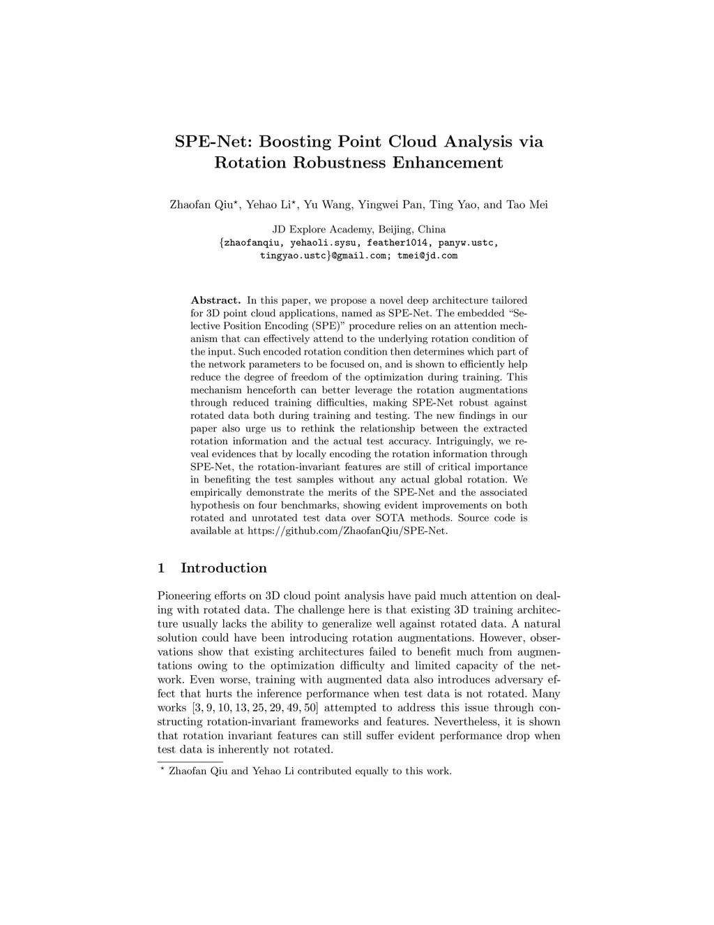 SPE-Net: Boosting Point Cloud Analysis via Rotation Robustness