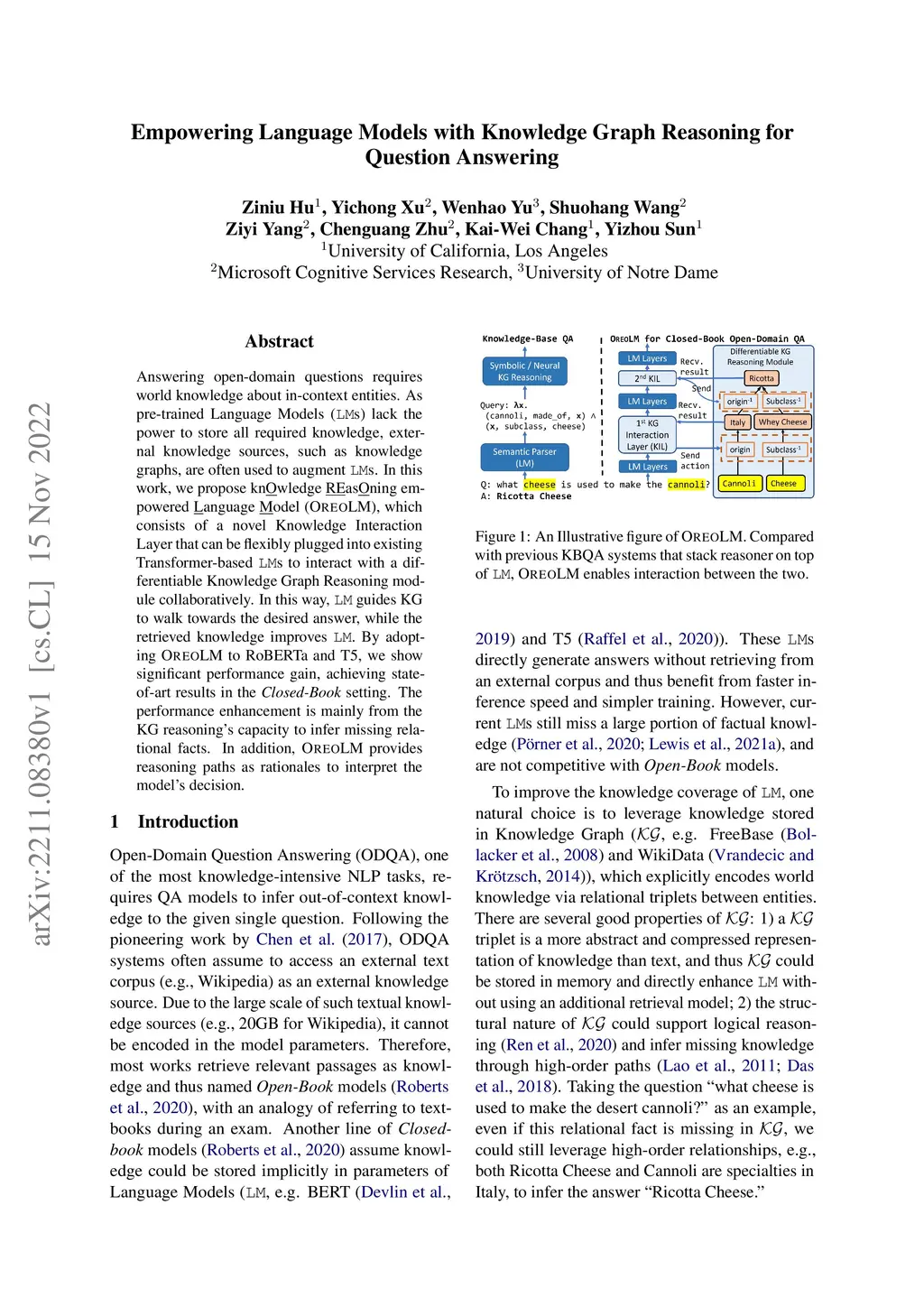 Answering open-domain questions requires world knowledge about in-context entities. As pre-trained Language Models (LMs) lack the power to store all required knowledge, external knowledge sources, such as knowledge graphs, are often used to augment LMs. In this work, we propose knOwledge REasOning empowered Language Model (OREO-LM), which consists of a novel Knowledge Interaction Layer that can be flexibly plugged into existing Transformer-based LMs to interact with a differentiable Knowledge Graph Reasoning module collaboratively. In this way, LM guides KG to walk towards the desired answer, while the retrieved knowledge improves LM. By adopting OREO-LM to RoBERTa and T5, we show significant performance gain, achieving state-of-art results in the Closed-Book setting. The performance enhancement is mainly from the KG reasoning's capacity to infer missing relational facts. In addition, OREO-LM provides reasoning paths as rationales to interpret the model's decision.