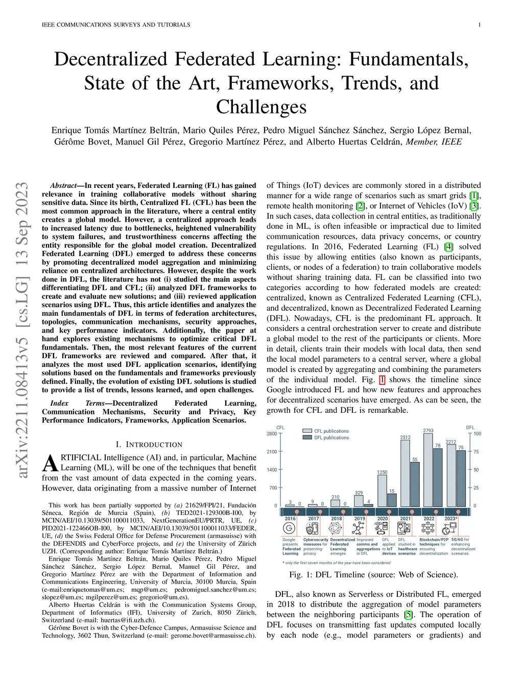 In recent years, Federated Learning (FL) has gained relevance in training collaborative models without sharing sensitive data. Since its birth, Centralized FL (CFL) has been the most common approach in the literature, where a central entity creates a global model. However, a centralized approach leads to increased latency due to bottlenecks, heightened vulnerability to system failures, and trustworthiness concerns affecting the entity responsible for the global model creation. Decentralized Federated Learning (DFL) emerged to address these concerns by promoting decentralized model aggregation and minimizing reliance on centralized architectures. However, despite the work done in DFL, the literature has not (i) studied the main aspects differentiating DFL and CFL; (ii) analyzed DFL frameworks to create and evaluate new solutions; and (iii) reviewed application scenarios using DFL. Thus, this article identifies and analyzes the main fundamentals of DFL in terms of federation architectures, topologies, communication mechanisms, security approaches, and key performance indicators. Additionally, the paper at hand explores existing mechanisms to optimize critical DFL fundamentals. Then, the most relevant features of the current DFL frameworks are reviewed and compared. After that, it analyzes the most used DFL application scenarios, identifying solutions based on the fundamentals and frameworks previously defined. Finally, the evolution of existing DFL solutions is studied to provide a list of trends, lessons learned, and open challenges.