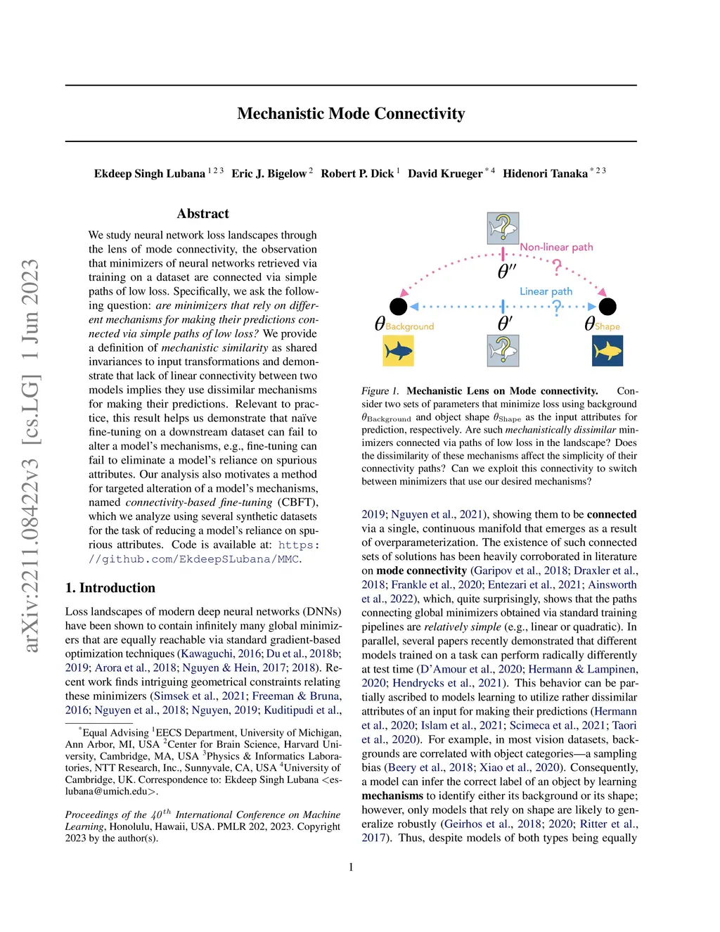 We study neural network loss landscapes through the lens of mode connectivity, the observation that minimizers of neural networks retrieved via training on a dataset are connected via simple paths of low loss. Specifically, we ask the following question: are minimizers that rely on different mechanisms for making their predictions connected via simple paths of low loss? We provide a definition of mechanistic similarity as shared invariances to input transformations and demonstrate that lack of linear connectivity between two models implies they use dissimilar mechanisms for making their predictions. Relevant to practice, this result helps us demonstrate that naive fine-tuning on a downstream dataset can fail to alter a model's mechanisms, e.g., fine-tuning can fail to eliminate a model's reliance on spurious attributes. Our analysis also motivates a method for targeted alteration of a model's mechanisms, named connectivity-based fine-tuning (CBFT), which we analyze using several synthetic datasets for the task of reducing a model's reliance on spurious attributes.