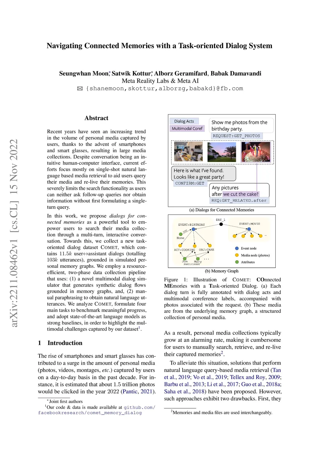 Recent years have seen an increasing trend in the volume of personal media captured by users, thanks to the advent of smartphones and smart glasses, resulting in large media collections. Despite conversation being an intuitive human-computer interface, current efforts focus mostly on single-shot natural language based media retrieval to aid users query their media and re-live their memories. This severely limits the search functionality as users can neither ask follow-up queries nor obtain information without first formulating a single-turn query. In this work, we propose dialogs for connected memories as a powerful tool to empower users to search their media collection through a multi-turn, interactive conversation. Towards this, we collect a new task-oriented dialog dataset COMET, which contains user<->assistant dialogs (totaling utterances), grounded in simulated personal memory graphs. We employ a resource-efficient, two-phase data collection pipeline that uses: (1) a novel multimodal dialog simulator that generates synthetic dialog flows grounded in memory graphs, and, (2) manual paraphrasing to obtain natural language utterances. We analyze COMET, formulate four main tasks to benchmark meaningful progress, and adopt state-of-the-art language models as strong baselines, in order to highlight the multimodal challenges captured by our dataset.
