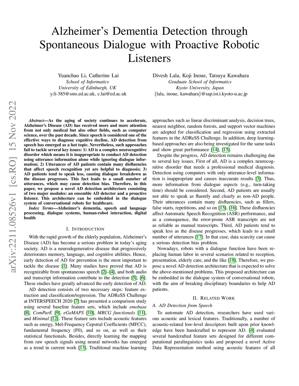 As the aging of society continues to accelerate, Alzheimer's Disease (AD) has received more and more attention from not only medical but also other fields, such as computer science, over the past decade. Since speech is considered one of the effective ways to diagnose cognitive decline, AD detection from speech has emerged as a hot topic. Nevertheless, such approaches fail to tackle several key issues: 1) AD is a complex neurocognitive disorder which means it is inappropriate to conduct AD detection using utterance information alone while ignoring dialogue information; 2) Utterances of AD patients contain many disfluencies that affect speech recognition yet are helpful to diagnosis; 3) AD patients tend to speak less, causing dialogue breakdown as the disease progresses. This fact leads to a small number of utterances, which may cause detection bias. Therefore, in this paper, we propose a novel AD detection architecture consisting of two major modules: an ensemble AD detector and a proactive listener. This architecture can be embedded in the dialogue system of conversational robots for healthcare.