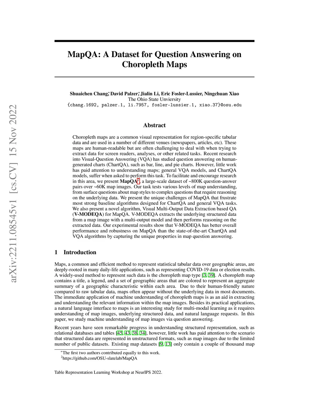 Choropleth maps are a common visual representation for region-specific tabular data and are used in a number of different venues (newspapers, articles, etc). These maps are human-readable but are often challenging to deal with when trying to extract data for screen readers, analyses, or other related tasks. Recent research into Visual-Question Answering (VQA) has studied question answering on human-generated charts (ChartQA), such as bar, line, and pie charts. However, little work has paid attention to understanding maps; general VQA models, and ChartQA models, suffer when asked to perform this task. To facilitate and encourage research in this area, we present MapQA, a large-scale dataset of ~800K question-answer pairs over ~60K map images. Our task tests various levels of map understanding, from surface questions about map styles to complex questions that require reasoning on the underlying data. We present the unique challenges of MapQA that frustrate most strong baseline algorithms designed for ChartQA and general VQA tasks. We also present a novel algorithm, Visual Multi-Output Data Extraction based QA (V-MODEQA) for MapQA. V-MODEQA extracts the underlying structured data from a map image with a multi-output model and then performs reasoning on the extracted data. Our experimental results show that V-MODEQA has better overall performance and robustness on MapQA than the state-of-the-art ChartQA and VQA algorithms by capturing the unique properties in map question answering.