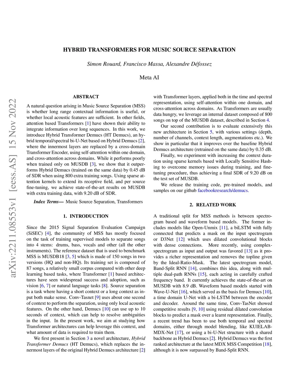 A natural question arising in Music Source Separation (MSS) is whether long range contextual information is useful, or whether local acoustic features are sufficient. In other fields, attention based Transformers have shown their ability to integrate information over long sequences. In this work, we introduce Hybrid Transformer Demucs (HT Demucs), an hybrid temporal/spectral bi-U-Net based on Hybrid Demucs, where the innermost layers are replaced by a cross-domain Transformer Encoder, using self-attention within one domain, and cross-attention across domains. While it performs poorly when trained only on MUSDB, we show that it outperforms Hybrid Demucs (trained on the same data) by 0.45 dB of SDR when using 800 extra training songs. Using sparse attention kernels to extend its receptive field, and per source fine-tuning, we achieve state-of-the-art results on MUSDB with extra training data, with 9.20 dB of SDR.