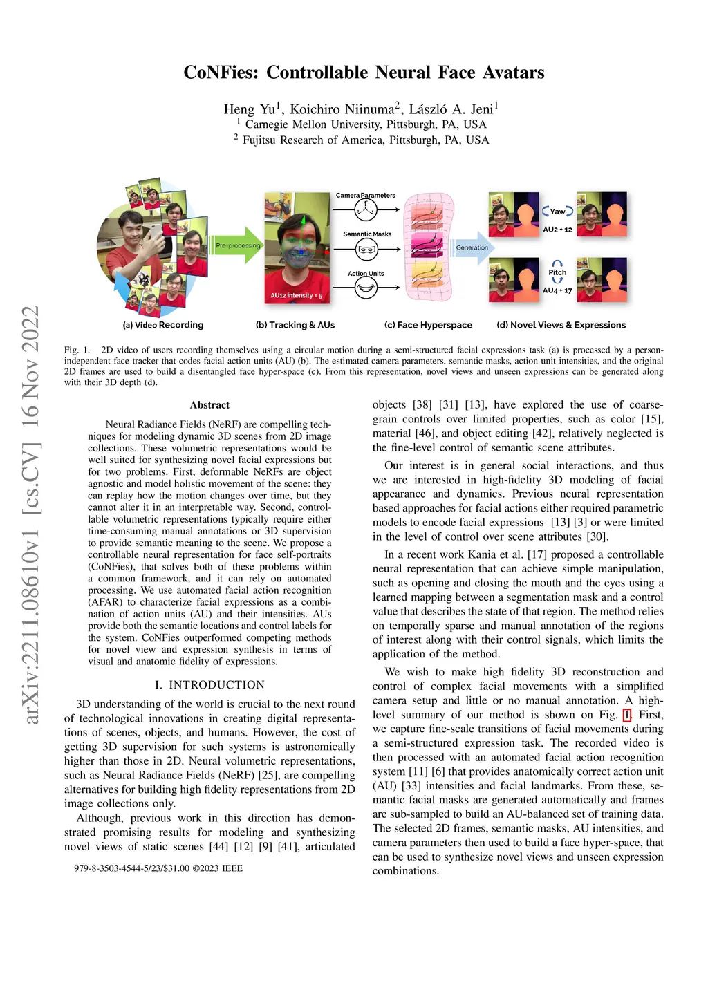 Neural Radiance Fields (NeRF) are compelling techniques for modeling dynamic 3D scenes from 2D image collections. These volumetric representations would be well suited for synthesizing novel facial expressions but for two problems. First, deformable NeRFs are object agnostic and model holistic movement of the scene: they can replay how the motion changes over time, but they cannot alter it in an interpretable way. Second, controllable volumetric representations typically require either time-consuming manual annotations or 3D supervision to provide semantic meaning to the scene. We propose a controllable neural representation for face self-portraits (CoNFies), that solves both of these problems within a common framework, and it can rely on automated processing. We use automated facial action recognition (AFAR) to characterize facial expressions as a combination of action units (AU) and their intensities. AUs provide both the semantic locations and control labels for the system. CoNFies outperformed competing methods for novel view and expression synthesis in terms of visual and anatomic fidelity of expressions.
