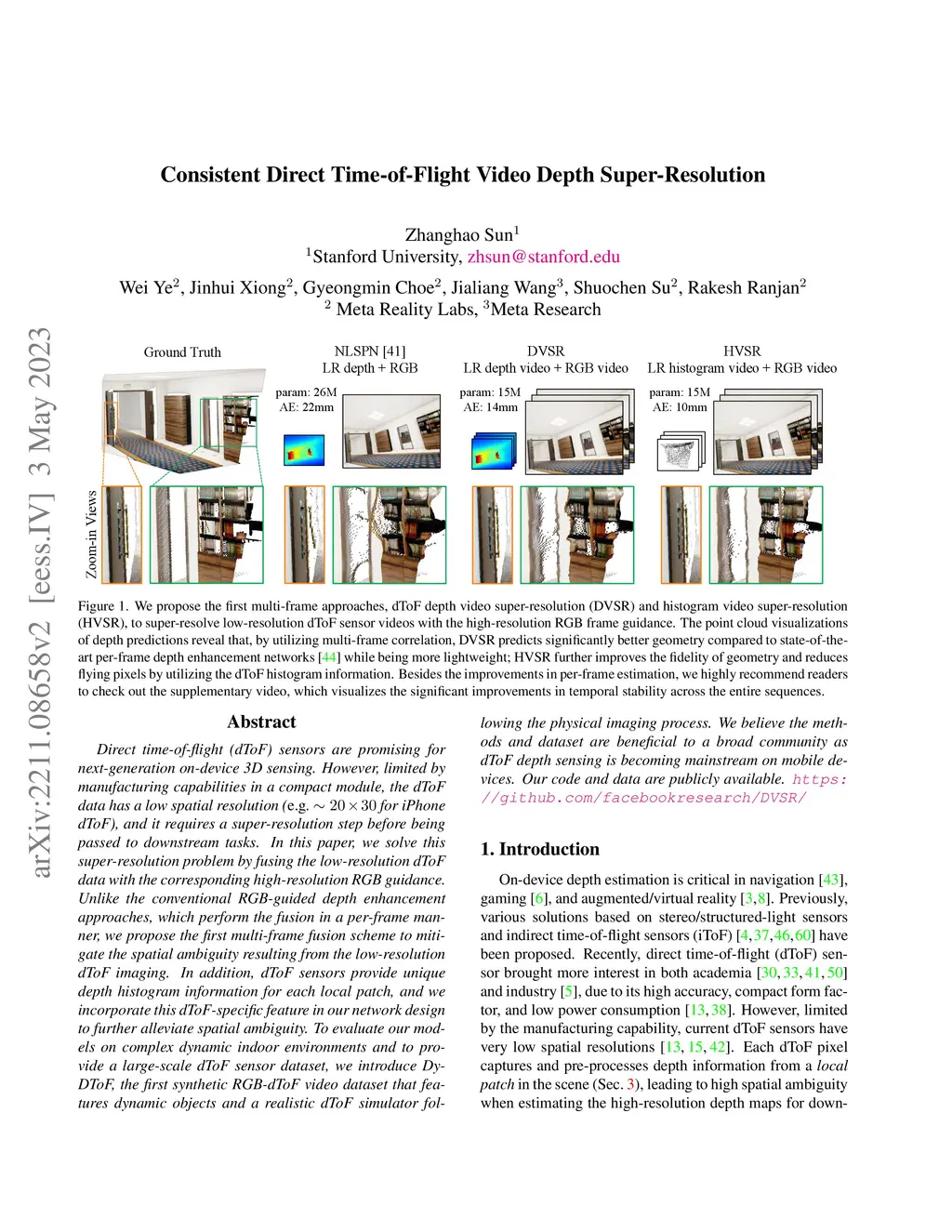Direct time-of-flight (dToF) sensors are promising for next-generation on-device 3D sensing. However, limited by manufacturing capabilities in a compact module, the dToF data has a low spatial resolution (e.g., for iPhone dToF), and it requires a super-resolution step before being passed to downstream tasks. In this paper, we solve this super-resolution problem by fusing the low-resolution dToF data with the corresponding high-resolution RGB guidance. Unlike the conventional RGB-guided depth enhancement approaches, which perform the fusion in a per-frame manner, we propose the first multi-frame fusion scheme to mitigate the spatial ambiguity resulting from the low-resolution dToF imaging. In addition, dToF sensors provide unique depth histogram information for each local patch, and we incorporate this dToF-specific feature in our network design to further alleviate spatial ambiguity. To evaluate our models on complex dynamic indoor environments and to provide a large-scale dToF sensor dataset, we introduce DyDToF, the first synthetic RGB-dToF video dataset that features dynamic objects and a realistic dToF simulator following the physical imaging process. We believe the methods and dataset are beneficial to a broad community as dToF depth sensing is becoming mainstream on mobile devices. Our code and data are publicly available: https://github.com/facebookresearch/DVSR/