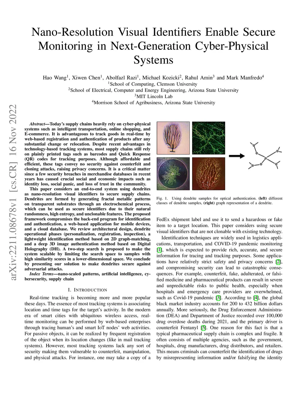 Today's supply chains heavily rely on cyber-physical systems such as intelligent transportation, online shopping, and E-commerce. It is advantageous to track goods in real-time by web-based registration and authentication of products after any substantial change or relocation. Despite recent advantages in technology-based tracking systems, most supply chains still rely on plainly printed tags such as barcodes and Quick Response (QR) codes for tracking purposes. Although affordable and efficient, these tags convey no security against counterfeit and cloning attacks, raising privacy concerns. It is a critical matter since a few security breaches in merchandise databases in recent years has caused crucial social and economic impacts such as identity loss, social panic, and loss of trust in the community. This paper considers an end-to-end system using dendrites as nano-resolution visual identifiers to secure supply chains. Dendrites are formed by generating fractal metallic patterns on transparent substrates through an electrochemical process, which can be used as secure identifiers due to their natural randomness, high entropy, and unclonable features. The proposed framework compromises the back-end program for identification and authentication, a web-based application for mobile devices, and a cloud database. We review architectural design, dendrite operational phases (personalization, registration, inspection), a lightweight identification method based on 2D graph-matching, and a deep 3D image authentication method based on Digital Holography (DH). A two-step search is proposed to make the system scalable by limiting the search space to samples with high similarity scores in a lower-dimensional space. We conclude by presenting our solution to make dendrites secure against adversarial attacks.