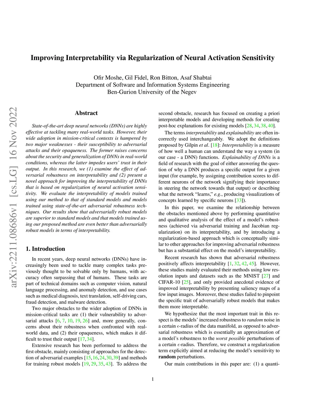 State-of-the-art deep neural networks (DNNs) are highly effective at tackling many real-world tasks. However, their wide adoption in mission-critical contexts is hampered by two major weaknesses - their susceptibility to adversarial attacks and their opaqueness. The former raises concerns about the security and generalization of DNNs in real-world conditions, whereas the latter impedes users' trust in their output. In this research, we (1) examine the effect of adversarial robustness on interpretability and (2) present a novel approach for improving the interpretability of DNNs that is based on regularization of neural activation sensitivity. We evaluate the interpretability of models trained using our method to that of standard models and models trained using state-of-the-art adversarial robustness techniques. Our results show that adversarially robust models are superior to standard models and that models trained using our proposed method are even better than adversarially robust models in terms of interpretability.
