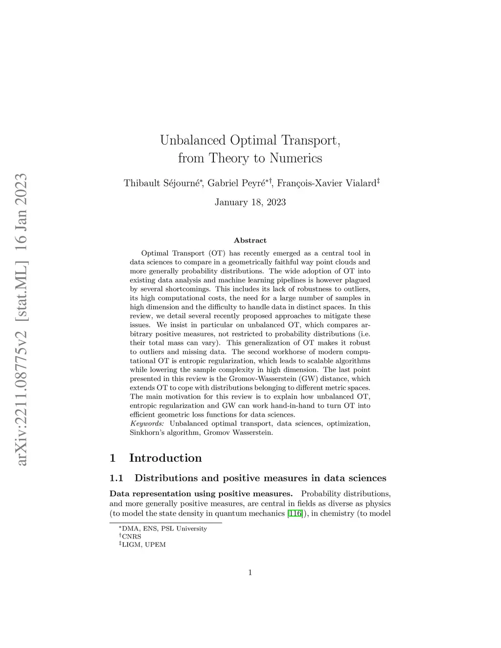 Optimal Transport (OT) has recently emerged as a central tool in data sciences to compare in a geometrically faithful way point clouds and more generally probability distributions. The wide adoption of OT into existing data analysis and machine learning pipelines is however plagued by several shortcomings. This includes its lack of robustness to outliers, its high computational costs, the need for a large number of samples in high dimension and the difficulty to handle data in distinct spaces. In this review, we detail several recently proposed approaches to mitigate these issues. We insist in particular on unbalanced OT, which compares arbitrary positive measures, not restricted to probability distributions (i.e. their total mass can vary). This generalization of OT makes it robust to outliers and missing data. The second workhorse of modern computational OT is entropic regularization, which leads to scalable algorithms while lowering the sample complexity in high dimension. The last point presented in this review is the Gromov-Wasserstein (GW) distance, which extends OT to cope with distributions belonging to different metric spaces. The main motivation for this review is to explain how unbalanced OT, entropic regularization and GW can work hand-in-hand to turn OT into efficient geometric loss functions for data sciences.