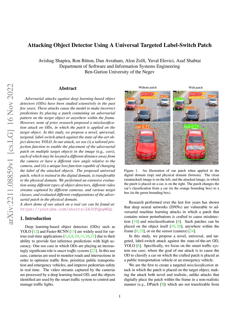 Adversarial attacks against deep learning-based object detectors (ODs) have been studied extensively in the past few years. These attacks cause the model to make incorrect predictions by placing a patch containing an adversarial pattern on the target object or anywhere within the frame. However, none of prior research proposed a misclassification attack on ODs, in which the patch is applied on the target object. In this study, we propose a novel, universal, targeted, label-switch attack against the state-of-the-art object detector, YOLO. In our attack, we use (i) a tailored projection function to enable the placement of the adversarial patch on multiple target objects in the image (e.g., cars), each of which may be located a different distance away from the camera or have a different view angle relative to the camera, and (ii) a unique loss function capable of changing the label of the attacked objects. The proposed universal patch, which is trained in the digital domain, is transferable to the physical domain. We performed an extensive evaluation using different types of object detectors, different video streams captured by different cameras, and various target classes, and evaluated different configurations of the adversarial patch in the physical domain.