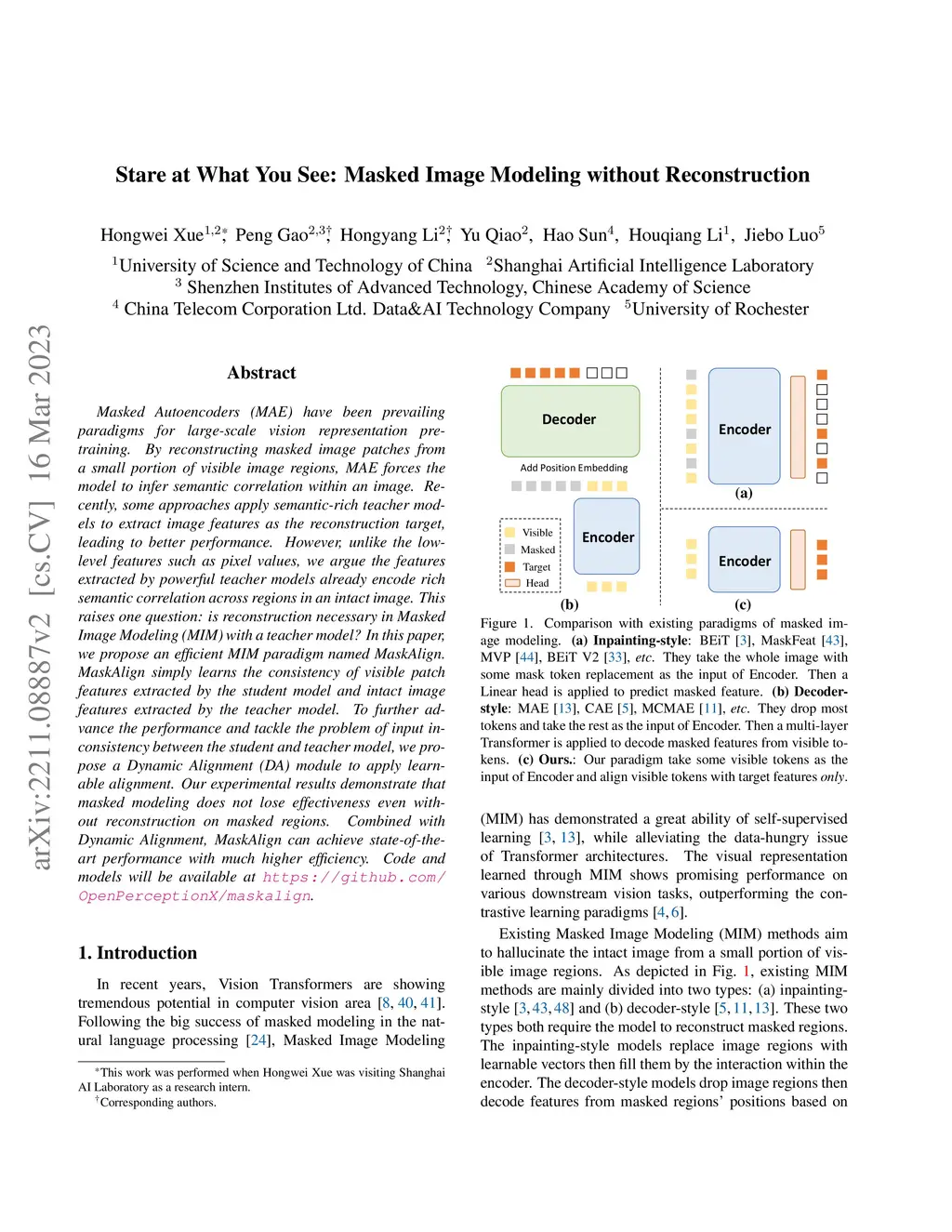 Masked Autoencoders (MAE) have been prevailing paradigms for large-scale vision representation pre-training. By reconstructing masked image patches from a small portion of visible image regions, MAE forces the model to infer semantic correlation within an image. Recently, some approaches apply semantic-rich teacher models to extract image features as the reconstruction target, leading to better performance. However, unlike the low-level features such as pixel values, we argue the features extracted by powerful teacher models already encode rich semantic correlation across regions in an intact image.This raises one question: is reconstruction necessary in Masked Image Modeling (MIM) with a teacher model? In this paper, we propose an efficient MIM paradigm named MaskAlign. MaskAlign simply learns the consistency of visible patch features extracted by the student model and intact image features extracted by the teacher model. To further advance the performance and tackle the problem of input inconsistency between the student and teacher model, we propose a Dynamic Alignment (DA) module to apply learnable alignment. Our experimental results demonstrate that masked modeling does not lose effectiveness even without reconstruction on masked regions. Combined with Dynamic Alignment, MaskAlign can achieve state-of-the-art performance with much higher efficiency. Code and models will be available at https://github.com/OpenPerceptionX/maskalign.