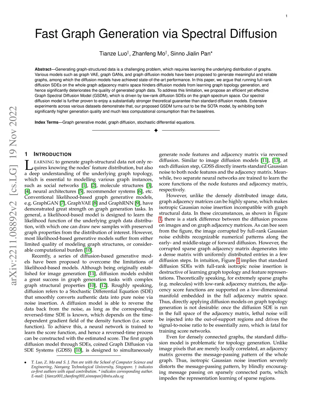 Generating graph-structured data is a challenging problem, which requires learning the underlying distribution of graphs. Various models such as graph VAE, graph GANs, and graph diffusion models have been proposed to generate meaningful and reliable graphs, among which the diffusion models have achieved state-of-the-art performance. In this paper, we argue that running full-rank diffusion SDEs on the whole graph adjacency matrix space hinders diffusion models from learning graph topology generation, and hence significantly deteriorates the quality of generated graph data. To address this limitation, we propose an efficient yet effective Graph Spectral Diffusion Model (GSDM), which is driven by low-rank diffusion SDEs on the graph spectrum space. Our spectral diffusion model is further proven to enjoy a substantially stronger theoretical guarantee than standard diffusion models. Extensive experiments across various datasets demonstrate that, our proposed GSDM turns out to be the SOTA model, by exhibiting both significantly higher generation quality and much less computational consumption than the baselines.