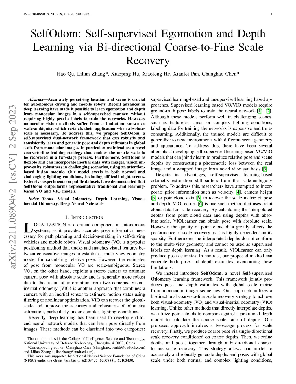 Accurately perceiving location and scene is crucial for autonomous driving and mobile robots. Recent advances in deep learning have made it possible to learn egomotion and depth from monocular images in a self-supervised manner, without requiring highly precise labels to train the networks. However, monocular vision methods suffer from a limitation known as scale-ambiguity, which restricts their application when absolute-scale is necessary. To address this, we propose SelfOdom, a self-supervised dual-network framework that can robustly and consistently learn and generate pose and depth estimates in global scale from monocular images. In particular, we introduce a novel coarse-to-fine training strategy that enables the metric scale to be recovered in a two-stage process. Furthermore, SelfOdom is flexible and can incorporate inertial data with images, which improves its robustness in challenging scenarios, using an attention-based fusion module. Our model excels in both normal and challenging lighting conditions, including difficult night scenes. Extensive experiments on public datasets have demonstrated that SelfOdom outperforms representative traditional and learning-based VO and VIO models.