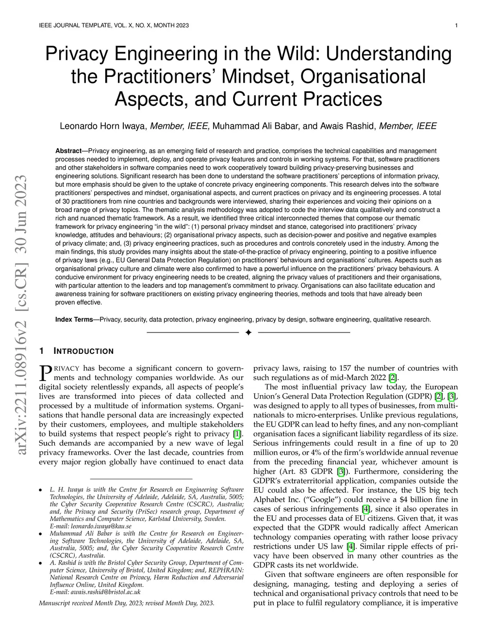 Privacy engineering, as an emerging field of research and practice, comprises the technical capabilities and management processes needed to implement, deploy, and operate privacy features and controls in working systems. For that, software practitioners and other stakeholders in software companies need to work cooperatively toward building privacy-preserving businesses and engineering solutions. Significant research has been done to understand the software practitioners' perceptions of information privacy, but more emphasis should be given to the uptake of concrete privacy engineering components. This research delves into the software practitioners' perspectives and mindset, organisational aspects, and current practices on privacy and its engineering processes. A total of 30 practitioners from nine countries and backgrounds were interviewed, sharing their experiences and voicing their opinions on a broad range of privacy topics. The thematic analysis methodology was adopted to code the interview data qualitatively and construct a rich and nuanced thematic framework. As a result, we identified three critical interconnected themes that compose our thematic framework for privacy engineering "in the wild": (1) personal privacy mindset and stance, categorised into practitioners' privacy knowledge, attitudes and behaviours; (2) organisational privacy aspects, such as decision-power and positive and negative examples of privacy climate; and, (3) privacy engineering practices, such as procedures and controls concretely used in the industry. Among the main findings, this study provides many insights about the state-of-the-practice of privacy engineering, pointing to a positive influence of privacy laws (e.g., EU General Data Protection Regulation) on practitioners' behaviours and organisations' cultures. Aspects such as organisational privacy culture and climate were also confirmed to have [...].