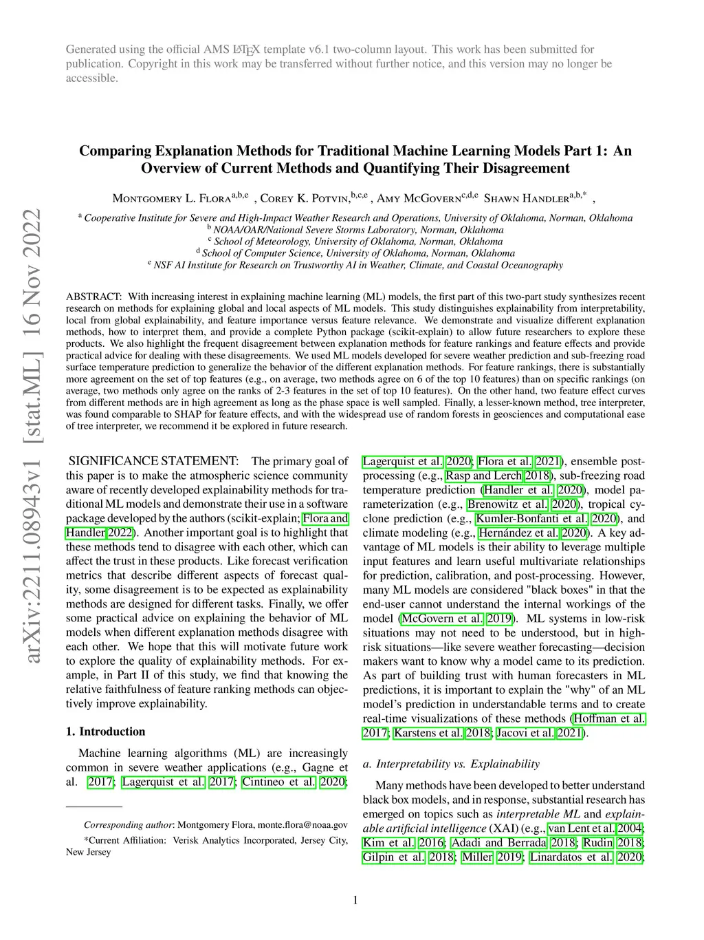 With increasing interest in explaining machine learning (ML) models, the first part of this two-part study synthesizes recent research on methods for explaining global and local aspects of ML models. This study distinguishes explainability from interpretability, local from global explainability, and feature importance versus feature relevance. We demonstrate and visualize different explanation methods, how to interpret them, and provide a complete Python package (scikit-explain) to allow future researchers to explore these products. We also highlight the frequent disagreement between explanation methods for feature rankings and feature effects and provide practical advice for dealing with these disagreements. We used ML models developed for severe weather prediction and sub-freezing road surface temperature prediction to generalize the behavior of the different explanation methods. For feature rankings, there is substantially more agreement on the set of top features (e.g., on average, two methods agree on 6 of the top 10 features) than on specific rankings (on average, two methods only agree on the ranks of 2-3 features in the set of top 10 features). On the other hand, two feature effect curves from different methods are in high agreement as long as the phase space is well sampled. Finally, a lesser-known method, tree interpreter, was found comparable to SHAP for feature effects, and with the widespread use of random forests in geosciences and computational ease of tree interpreter, we recommend it be explored in future research.
