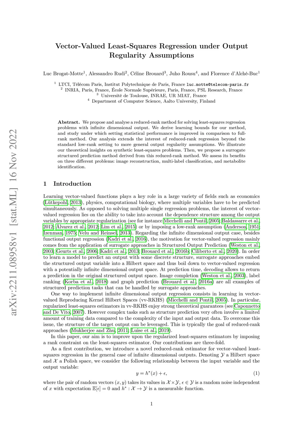We propose and analyse a reduced-rank method for solving least-squares regression problems with infinite dimensional output. We derive learning bounds for our method, and study under which setting statistical performance is improved in comparison to full-rank method. Our analysis extends the interest of reduced-rank regression beyond the standard low-rank setting to more general output regularity assumptions. We illustrate our theoretical insights on synthetic least-squares problems. Then, we propose a surrogate structured prediction method derived from this reduced-rank method. We assess its benefits on three different problems: image reconstruction, multi-label classification, and metabolite identification.