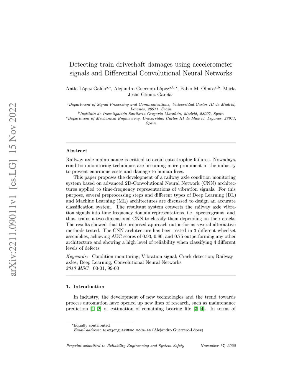 Railway axle maintenance is critical to avoid catastrophic failures. Nowadays, condition monitoring techniques are becoming more prominent in the industry to prevent enormous costs and damage to human lives. This paper proposes the development of a railway axle condition monitoring system based on advanced 2D-Convolutional Neural Network (CNN) architectures applied to time-frequency representations of vibration signals. For this purpose, several preprocessing steps and different types of Deep Learning (DL) and Machine Learning (ML) architectures are discussed to design an accurate classification system. The resultant system converts the railway axle vibration signals into time-frequency domain representations, i.e., spectrograms, and, thus, trains a two-dimensional CNN to classify them depending on their cracks. The results showed that the proposed approach outperforms several alternative methods tested. The CNN architecture has been tested in 3 different wheelset assemblies, achieving AUC scores of 0.93, 0.86, and 0.75 outperforming any other architecture and showing a high level of reliability when classifying 4 different levels of defects.