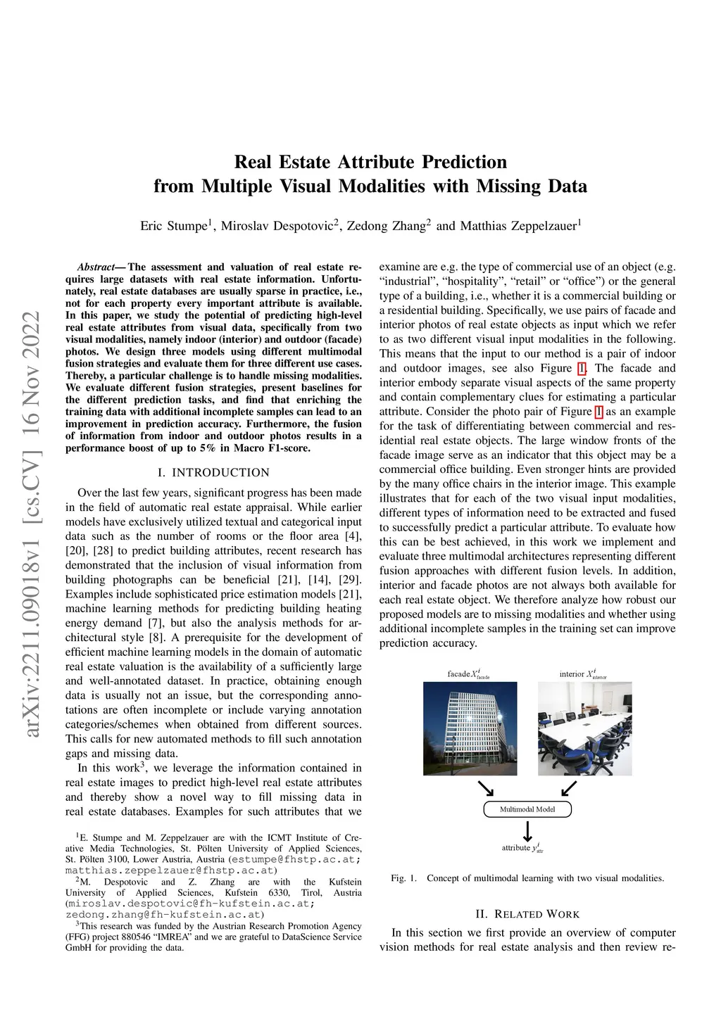 The assessment and valuation of real estate requires large datasets with real estate information. Unfortunately, real estate databases are usually sparse in practice, i.e., not for each property every important attribute is available. In this paper, we study the potential of predicting high-level real estate attributes from visual data, specifically from two visual modalities, namely indoor (interior) and outdoor (facade) photos. We design three models using different multimodal fusion strategies and evaluate them for three different use cases. Thereby, a particular challenge is to handle missing modalities. We evaluate different fusion strategies, present baselines for the different prediction tasks, and find that enriching the training data with additional incomplete samples can lead to an improvement in prediction accuracy. Furthermore, the fusion of information from indoor and outdoor photos results in a performance boost of up to 5% in Macro F1-score.