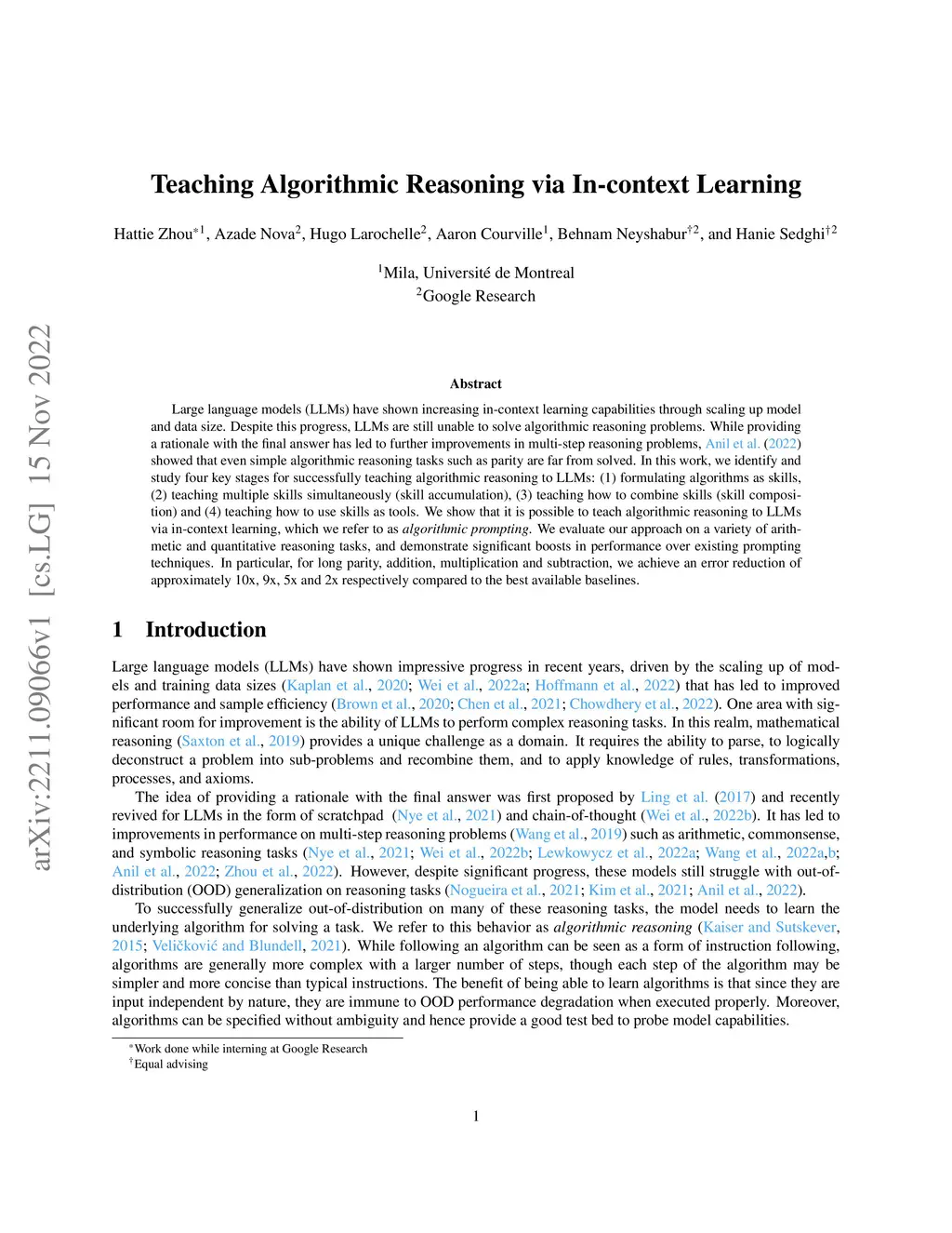 Large language models (LLMs) have shown increasing in-context learning capabilities through scaling up model and data size. Despite this progress, LLMs are still unable to solve algorithmic reasoning problems. While providing a rationale with the final answer has led to further improvements in multi-step reasoning problems, Anil et al. 2022 showed that even simple algorithmic reasoning tasks such as parity are far from solved. In this work, we identify and study four key stages for successfully teaching algorithmic reasoning to LLMs: (1) formulating algorithms as skills, (2) teaching multiple skills simultaneously (skill accumulation), (3) teaching how to combine skills (skill composition) and (4) teaching how to use skills as tools. We show that it is possible to teach algorithmic reasoning to LLMs via in-context learning, which we refer to as algorithmic prompting. We evaluate our approach on a variety of arithmetic and quantitative reasoning tasks, and demonstrate significant boosts in performance over existing prompting techniques. In particular, for long parity, addition, multiplication and subtraction, we achieve an error reduction of approximately 10x, 9x, 5x and 2x respectively compared to the best available baselines.