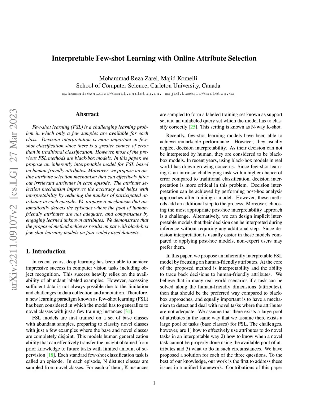 Few-shot learning (FSL) presents a challenging learning problem in which only a few samples are available for each class. Decision interpretation is more important in few-shot classification due to a greater chance of error compared to traditional classification. However, the majority of the previous FSL methods are black-box models. In this paper, we propose an inherently interpretable model for FSL based on human-friendly attributes. Previously, human-friendly attributes have been utilized to train models with the potential for human interaction and interpretability. However, such approaches are not directly extendible to the few-shot classification scenario. Moreover, we propose an online attribute selection mechanism to effectively filter out irrelevant attributes in each episode. The attribute selection mechanism improves accuracy and helps with interpretability by reducing the number of attributes that participate in each episode. We further propose a mechanism that automatically detects the episodes where the pool of available human-friendly attributes is insufficient, and subsequently augments it by engaging some learned unknown attributes. We demonstrate that the proposed method achieves results on par with black-box few-shot learning models on four widely used datasets. We also empirically evaluate the level of decision alignment between different models and human understanding and show that our model outperforms the comparison methods based on this criterion.