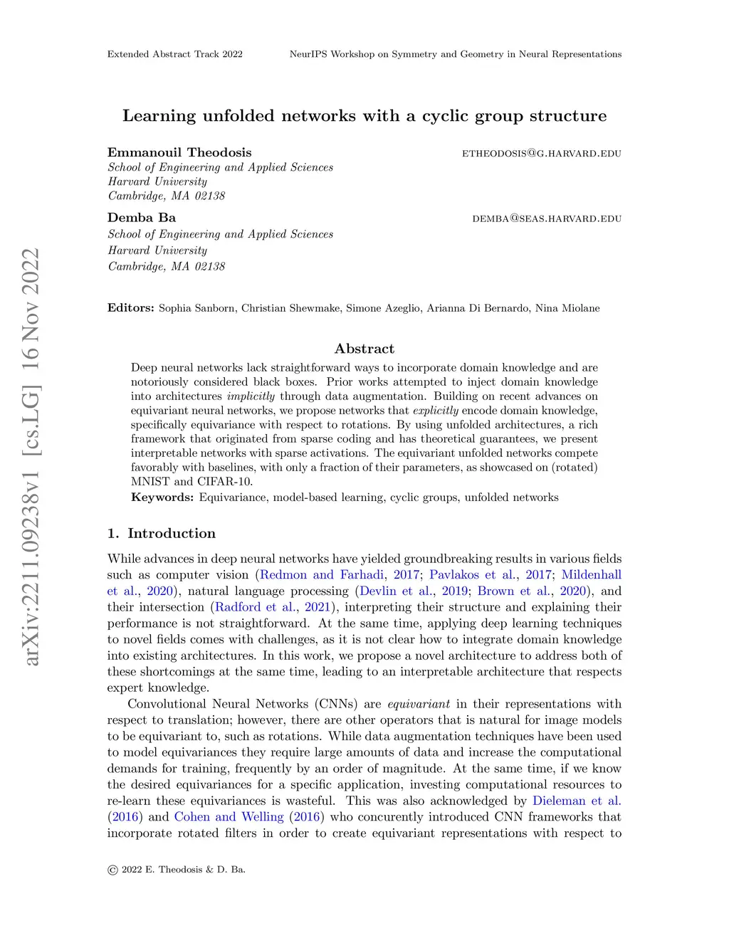 Deep neural networks lack straightforward ways to incorporate domain knowledge and are notoriously considered black boxes. Prior works attempted to inject domain knowledge into architectures implicitly through data augmentation. Building on recent advances on equivariant neural networks, we propose networks that explicitly encode domain knowledge, specifically equivariance with respect to rotations. By using unfolded architectures, a rich framework that originated from sparse coding and has theoretical guarantees, we present interpretable networks with sparse activations. The equivariant unfolded networks compete favorably with baselines, with only a fraction of their parameters, as showcased on (rotated) MNIST and CIFAR-10.
