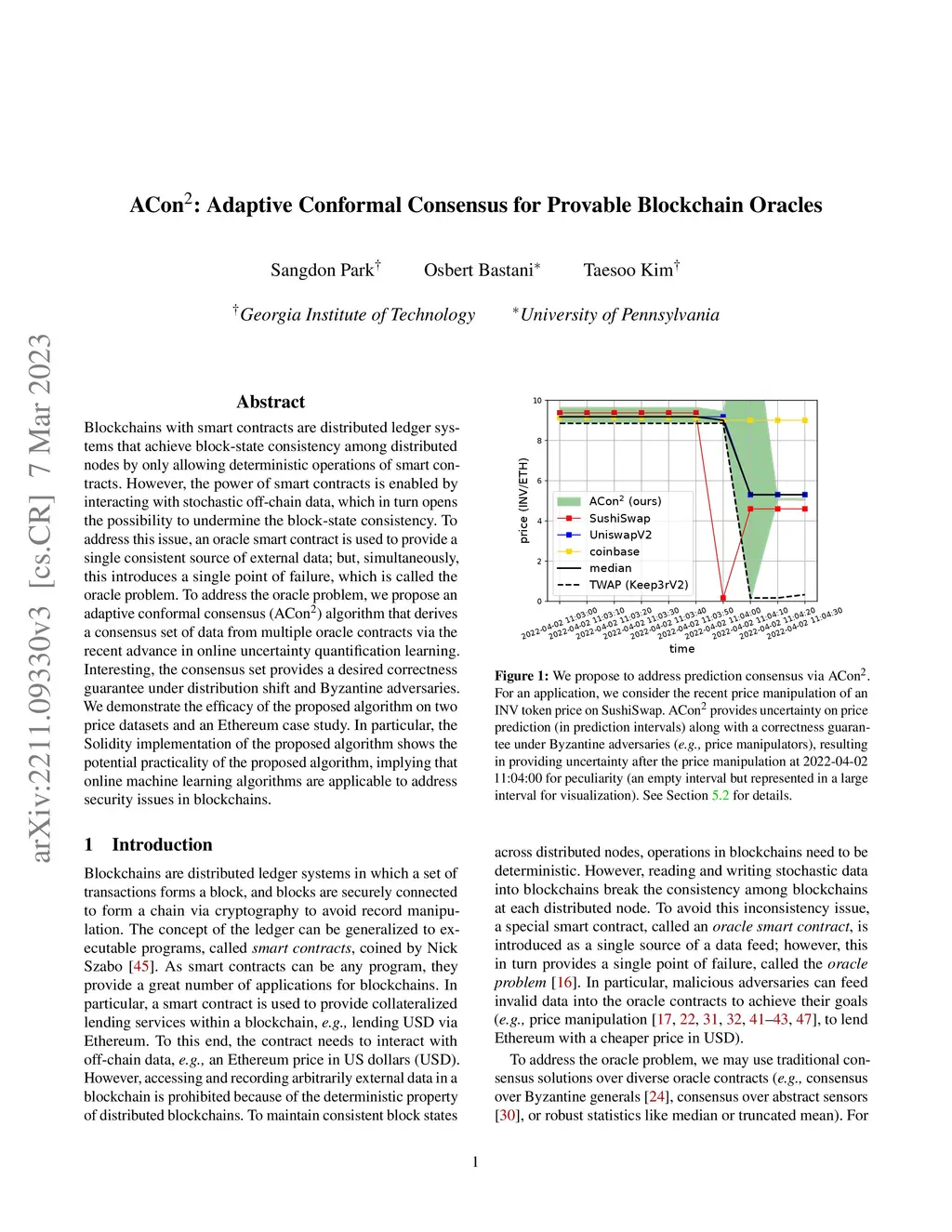 Blockchains with smart contracts are distributed ledger systems that achieve block-state consistency among distributed nodes by only allowing deterministic operations of smart contracts. However, the power of smart contracts is enabled by interacting with stochastic off-chain data, which in turn opens the possibility to undermine the block-state consistency. To address this issue, an oracle smart contract is used to provide a single consistent source of external data; but, simultaneously, this introduces a single point of failure, which is called the oracle problem. To address the oracle problem, we propose an adaptive conformal consensus (ACon) algorithm that derives a consensus set of data from multiple oracle contracts via the recent advance in online uncertainty quantification learning. Interesting, the consensus set provides a desired correctness guarantee under distribution shift and Byzantine adversaries. We demonstrate the efficacy of the proposed algorithm on two price datasets and an Ethereum case study. In particular, the Solidity implementation of the proposed algorithm shows the potential practicality of the proposed algorithm, implying that online machine learning algorithms are applicable to address security issues in blockchains.