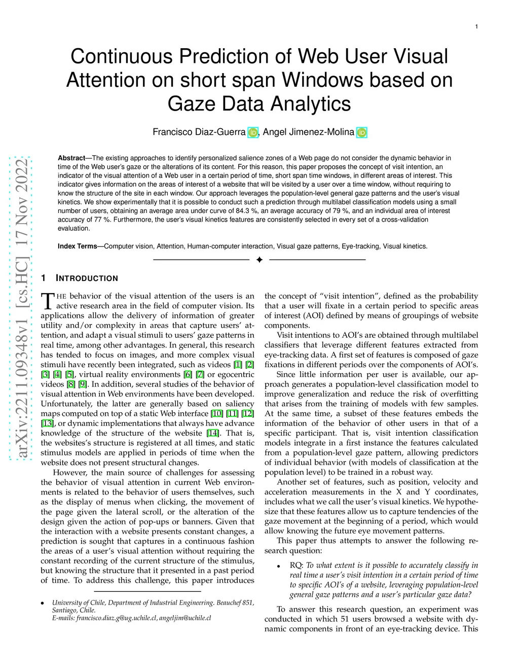 The existing approaches to identify personalized salience zones of a Web page do not consider the dynamic behavior in time of the Web user's gaze or the alterations of its content. For this reason, this paper proposes the concept of visit intention, an indicator of the visual attention of a Web user in a certain period of time, short span time windows, in different areas of interest. This indicator gives information on the areas of interest of a website that will be visited by a user over a time window, without requiring to know the structure of the site in each window. Our approach leverages the population-level general gaze patterns and the user's visual kinetics. We show experimentally that it is possible to conduct such a prediction through multilabel classification models using a small number of users, obtaining an average area under curve of 84.3 %, an average accuracy of 79 %, and an individual area of interest accuracy of 77 %. Furthermore, the user's visual kinetics features are consistently selected in every set of a cross-validation evaluation.