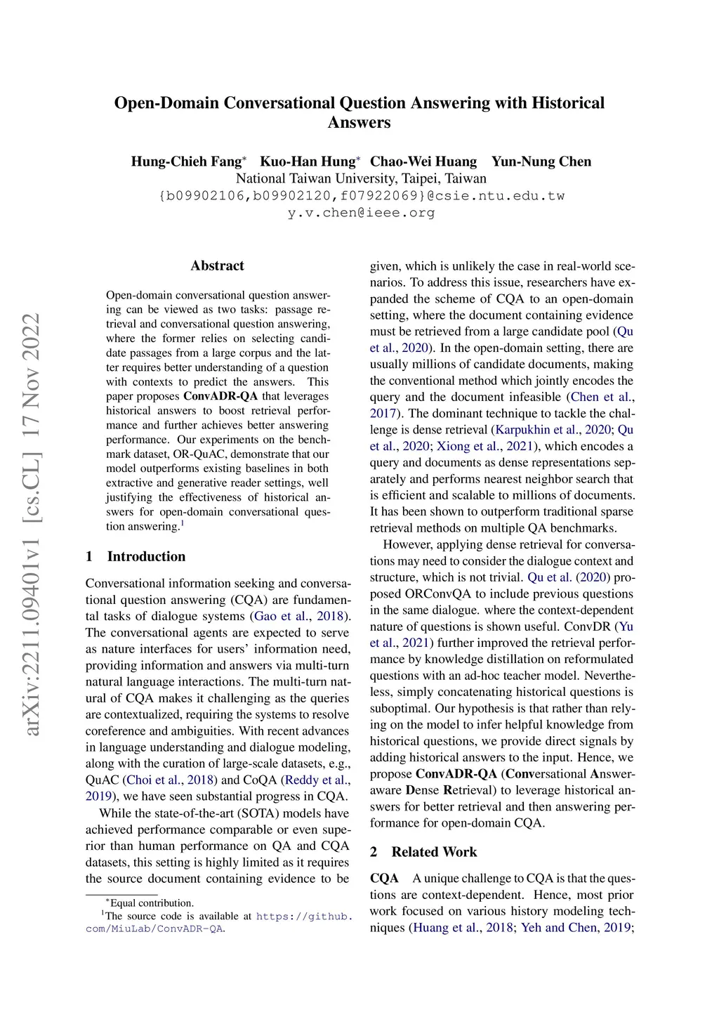 Open-Domain Conversational Question Answering with Historical Answers