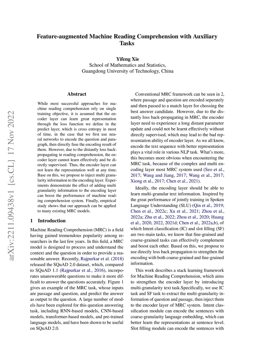 While most successful approaches for machine reading comprehension rely on single training objective, it is assumed that the encoder layer can learn great representation through the loss function we define in the predict layer, which is cross entropy in most of time, in the case that we first use neural networks to encode the question and paragraph, then directly fuse the encoding result of them. However, due to the distantly loss backpropagating in reading comprehension, the encoder layer cannot learn effectively and be directly supervised. Thus, the encoder layer can not learn the representation well at any time. Base on this, we propose to inject multi granularity information to the encoding layer. Experiments demonstrate the effect of adding multi granularity information to the encoding layer can boost the performance of machine reading comprehension system. Finally, empirical study shows that our approach can be applied to many existing MRC models.