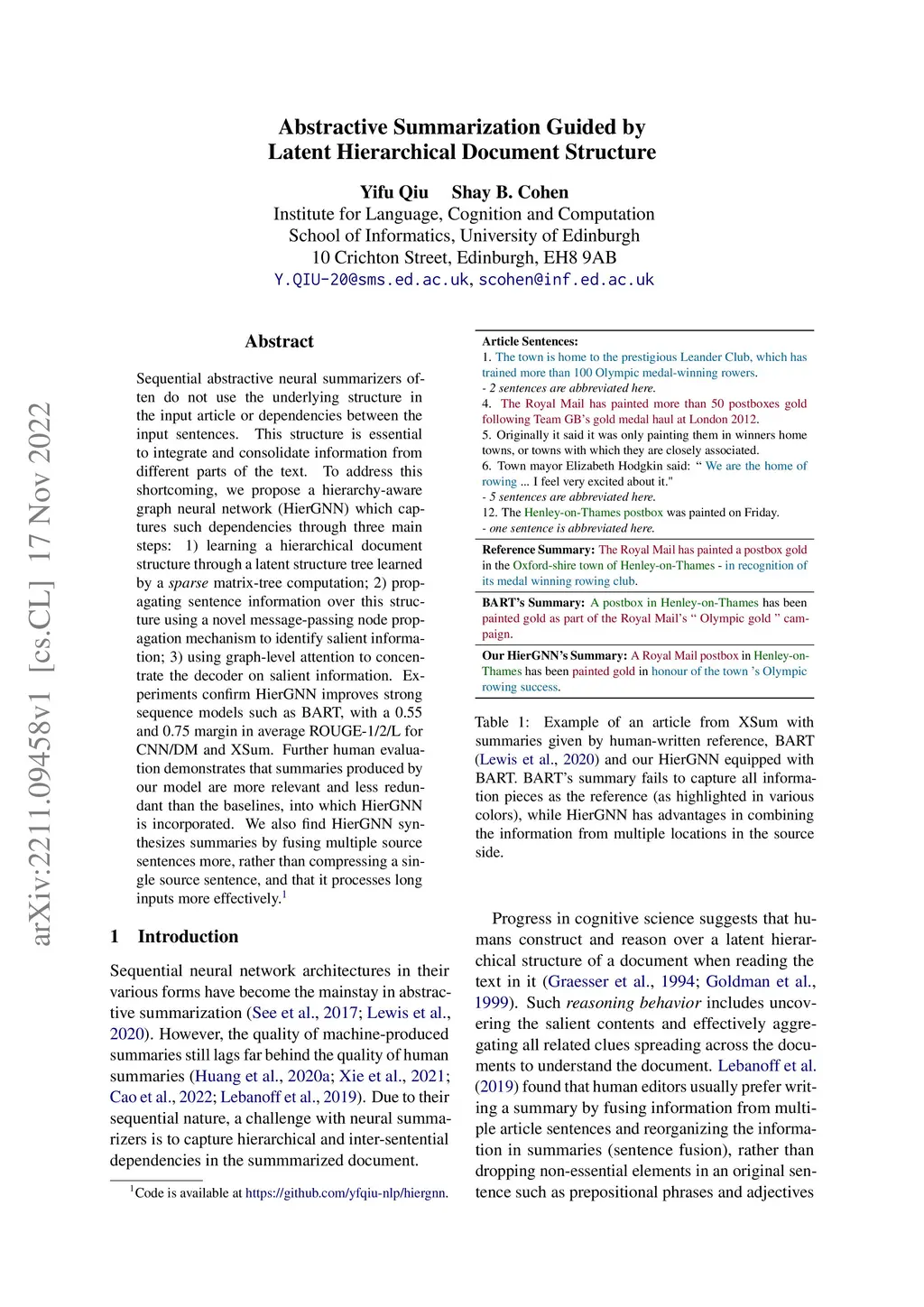 Sequential abstractive neural summarizers often do not use the underlying structure in the input article or dependencies between the input sentences. This structure is essential to integrate and consolidate information from different parts of the text. To address this shortcoming, we propose a hierarchy-aware graph neural network (HierGNN) which captures such dependencies through three main steps: 1) learning a hierarchical document structure through a latent structure tree learned by a sparse matrix-tree computation; 2) propagating sentence information over this structure using a novel message-passing node propagation mechanism to identify salient information; 3) using graph-level attention to concentrate the decoder on salient information. Experiments confirm HierGNN improves strong sequence models such as BART, with a 0.55 and 0.75 margin in average ROUGE-1/2/L for CNN/DM and XSum. Further human evaluation demonstrates that summaries produced by our model are more relevant and less redundant than the baselines, into which HierGNN is incorporated. We also find HierGNN synthesizes summaries by fusing multiple source sentences more, rather than compressing a single source sentence, and that it processes long inputs more effectively.