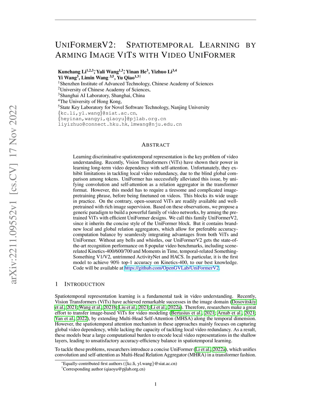 UniFormerV2: Spatiotemporal Learning by Arming Image ViTs with Video