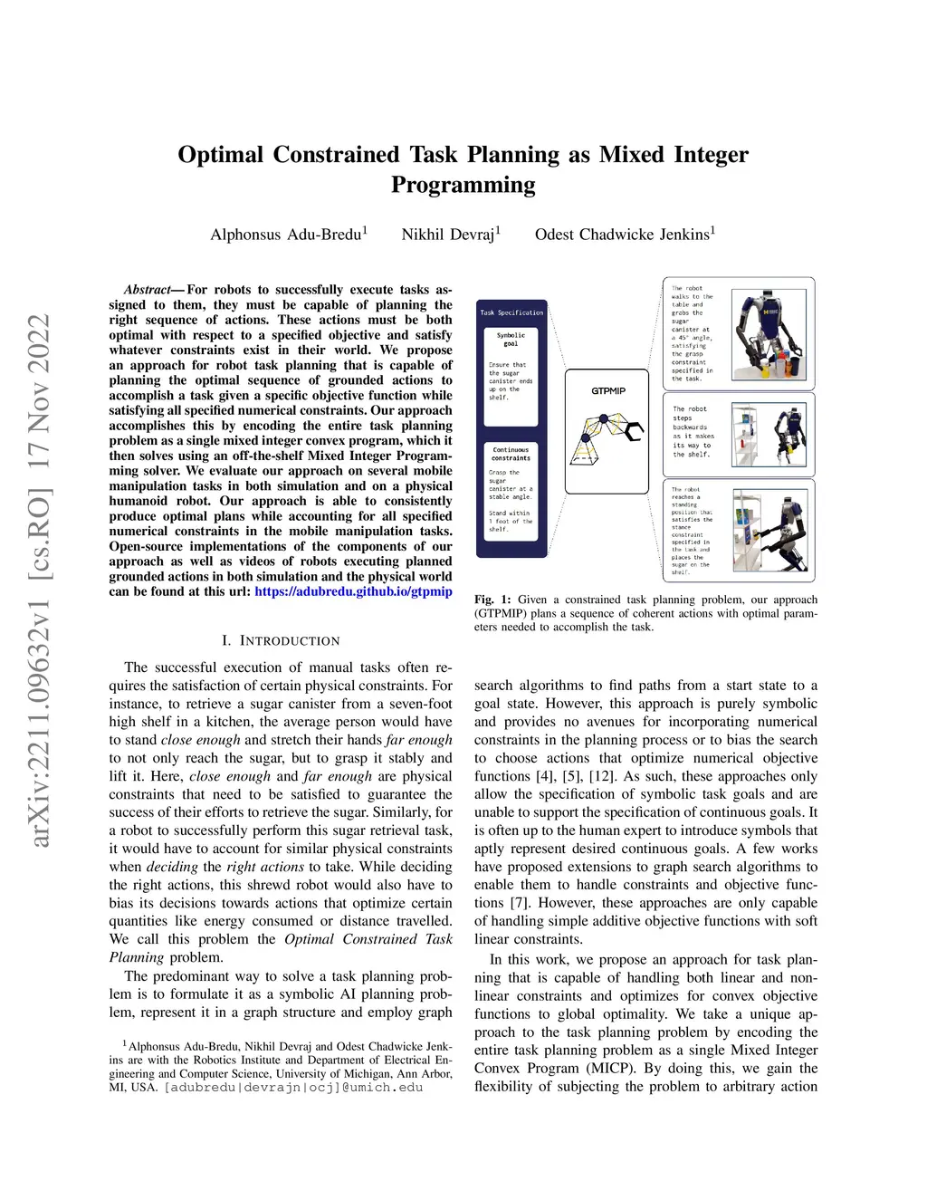 For robots to successfully execute tasks assigned to them, they must be capable of planning the right sequence of actions. These actions must be both optimal with respect to a specified objective and satisfy whatever constraints exist in their world. We propose an approach for robot task planning that is capable of planning the optimal sequence of grounded actions to accomplish a task given a specific objective function while satisfying all specified numerical constraints. Our approach accomplishes this by encoding the entire task planning problem as a single mixed integer convex program, which it then solves using an off-the-shelf Mixed Integer Programming solver. We evaluate our approach on several mobile manipulation tasks in both simulation and on a physical humanoid robot. Our approach is able to consistently produce optimal plans while accounting for all specified numerical constraints in the mobile manipulation tasks. Open-source implementations of the components of our approach as well as videos of robots executing planned grounded actions in both simulation and the physical world can be found at this url: https://adubredu.github.io/gtpmip