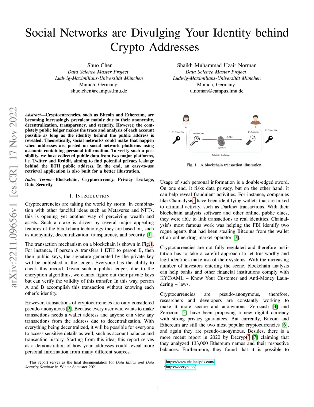 Cryptocurrencies, such as Bitcoin and Ethereum, are becoming increasingly prevalent mainly due to their anonymity, decentralization, transparency, and security. However, the completely public ledger makes the trace and analysis of each account possible as long as the identity behind the public address is revealed. Theoretically, social networks could make that happen when addresses are posted on social network platforms using accounts containing personal information. To verify such a possibility, we have collected public data from two major platforms, i.e. Twitter and Reddit, aiming to find potential privacy leakage behind the ETH public address. In the end, an easy-to-use retrieval application is also built for a better illustration.