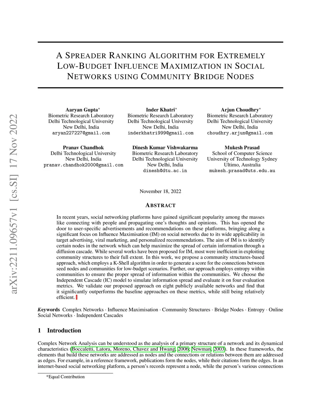 In recent years, social networking platforms have gained significant popularity among the masses like connecting with people and propagating ones thoughts and opinions. This has opened the door to user-specific advertisements and recommendations on these platforms, bringing along a significant focus on Influence Maximisation (IM) on social networks due to its wide applicability in target advertising, viral marketing, and personalized recommendations. The aim of IM is to identify certain nodes in the network which can help maximize the spread of certain information through a diffusion cascade. While several works have been proposed for IM, most were inefficient in exploiting community structures to their full extent. In this work, we propose a community structures-based approach, which employs a K-Shell algorithm in order to generate a score for the connections between seed nodes and communities for low-budget scenarios. Further, our approach employs entropy within communities to ensure the proper spread of information within the communities. We choose the Independent Cascade (IC) model to simulate information spread and evaluate it on four evaluation metrics. We validate our proposed approach on eight publicly available networks and find that it significantly outperforms the baseline approaches on these metrics, while still being relatively efficient.