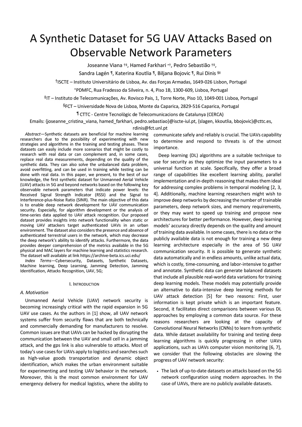 Synthetic datasets are beneficial for machine learning researchers due to the possibility of experimenting with new strategies and algorithms in the training and testing phases. These datasets can easily include more scenarios that might be costly to research with real data or can complement and, in some cases, replace real data measurements, depending on the quality of the synthetic data. They can also solve the unbalanced data problem, avoid overfitting, and can be used in training while testing can be done with real data. In this paper, we present, to the best of our knowledge, the first synthetic dataset for Unmanned Aerial Vehicle (UAV) attacks in 5G and beyond networks based on the following key observable network parameters that indicate power levels: the Received Signal Strength Indicator (RSSI) and the Signal to Interference-plus-Noise Ratio (SINR). The main objective of this data is to enable deep network development for UAV communication security. Especially, for algorithm development or the analysis of time-series data applied to UAV attack recognition. Our proposed dataset provides insights into network functionality when static or moving UAV attackers target authenticated UAVs in an urban environment. The dataset also considers the presence and absence of authenticated terrestrial users in the network, which may decrease the deep networks ability to identify attacks. Furthermore, the data provides deeper comprehension of the metrics available in the 5G physical and MAC layers for machine learning and statistics research. The dataset will available at link archive-beta.ics.uci.edu