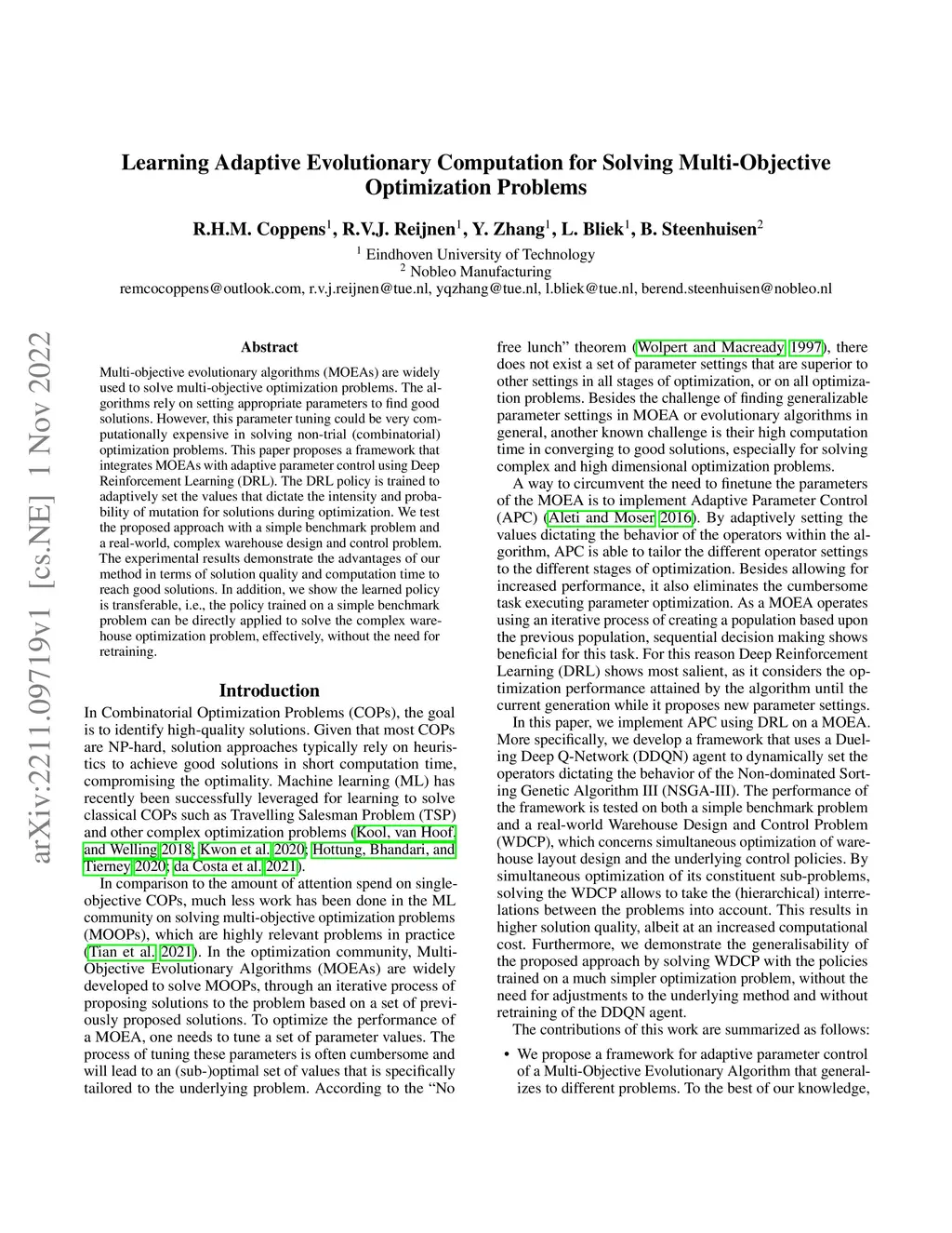 Multi-objective evolutionary algorithms (MOEAs) are widely used to solve multi-objective optimization problems. The algorithms rely on setting appropriate parameters to find good solutions. However, this parameter tuning could be very computationally expensive in solving non-trial (combinatorial) optimization problems. This paper proposes a framework that integrates MOEAs with adaptive parameter control using Deep Reinforcement Learning (DRL). The DRL policy is trained to adaptively set the values that dictate the intensity and probability of mutation for solutions during optimization. We test the proposed approach with a simple benchmark problem and a real-world, complex warehouse design and control problem. The experimental results demonstrate the advantages of our method in terms of solution quality and computation time to reach good solutions. In addition, we show the learned policy is transferable, i.e., the policy trained on a simple benchmark problem can be directly applied to solve the complex warehouse optimization problem, effectively, without the need for retraining.
